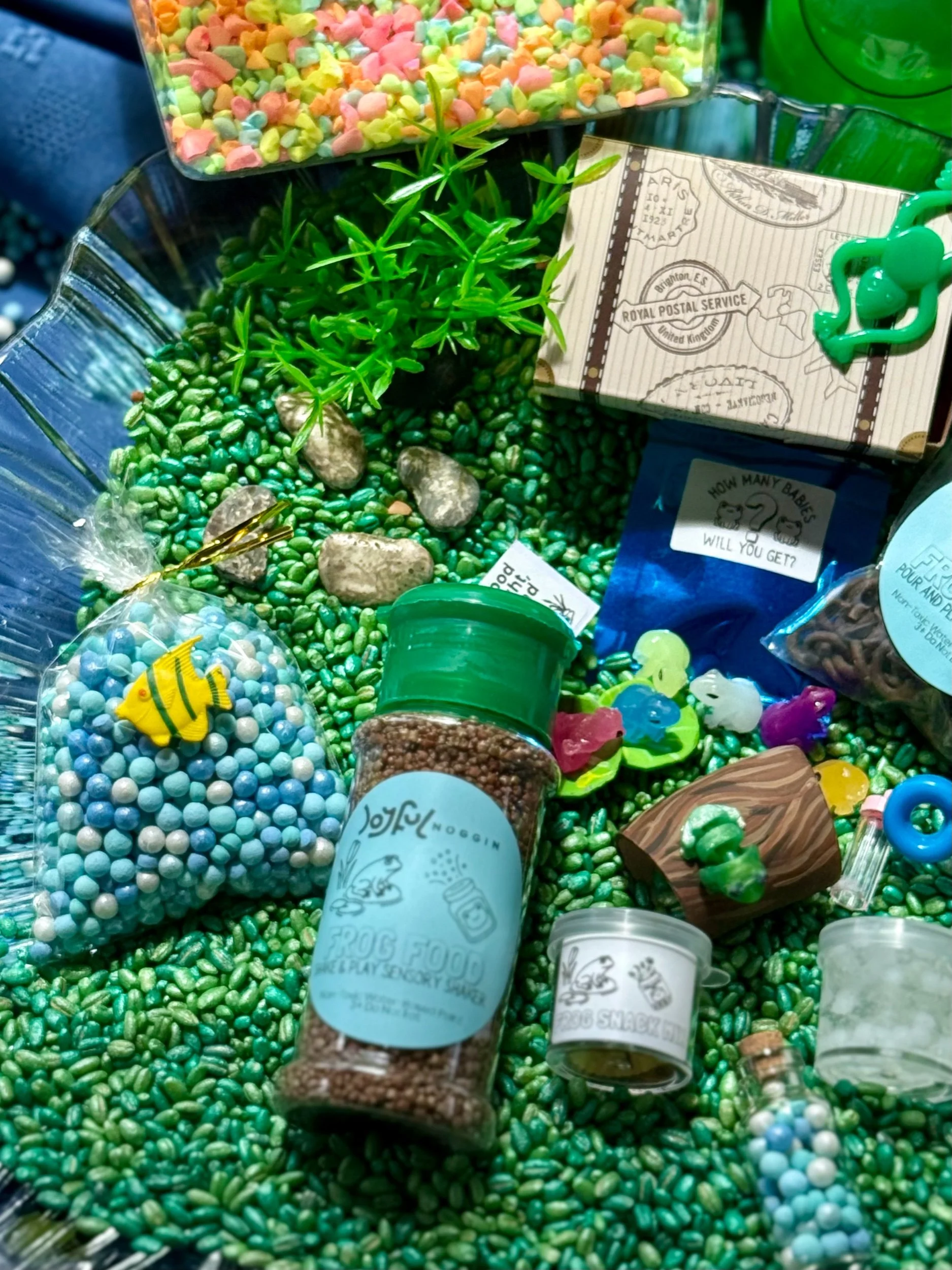 🐟 Bag of Crystal Waters Mix + Surprise Fish Friend – A scoopable sensory mix that mimics pond water, hiding a playful fish friend inside to discover.