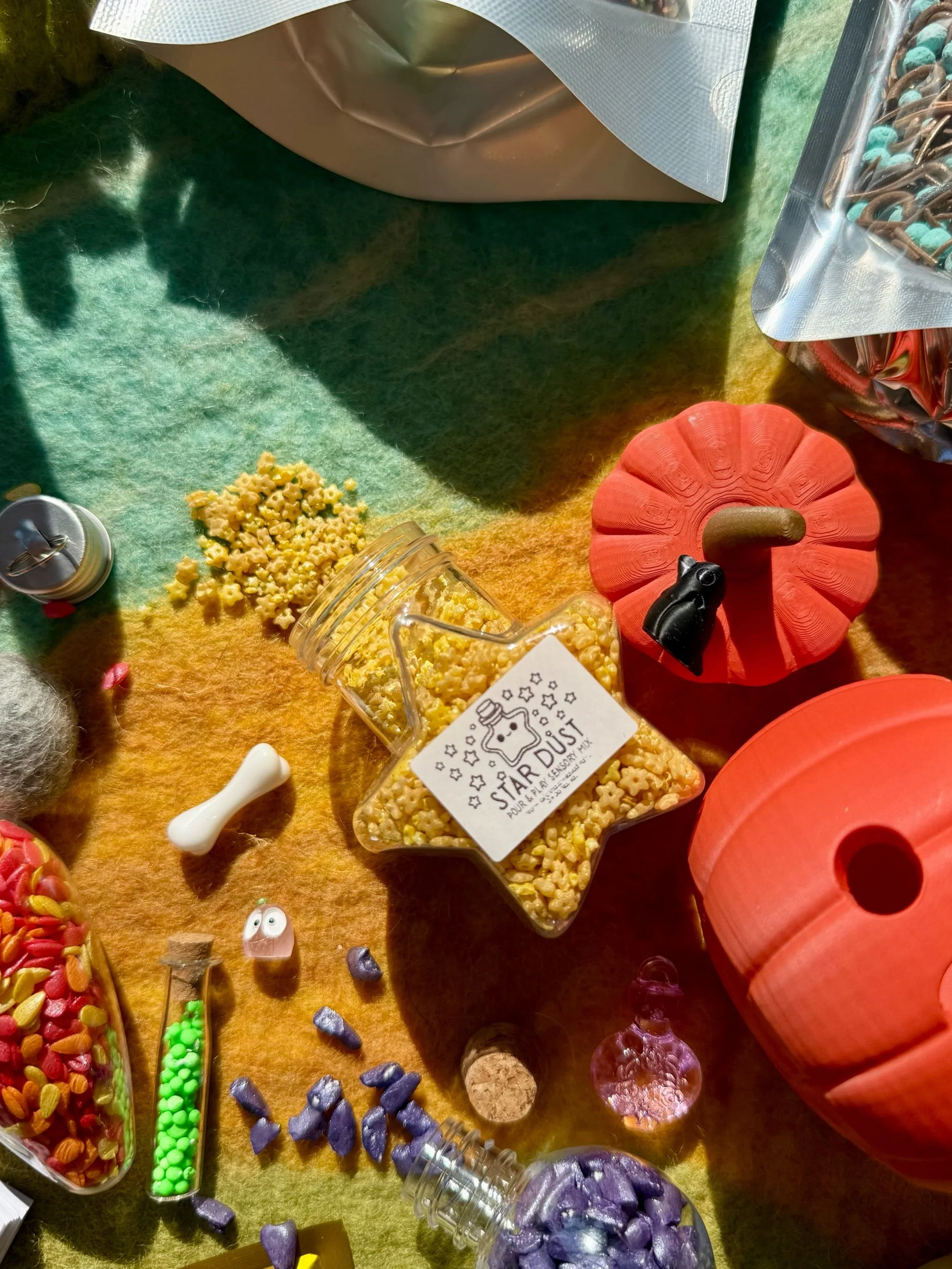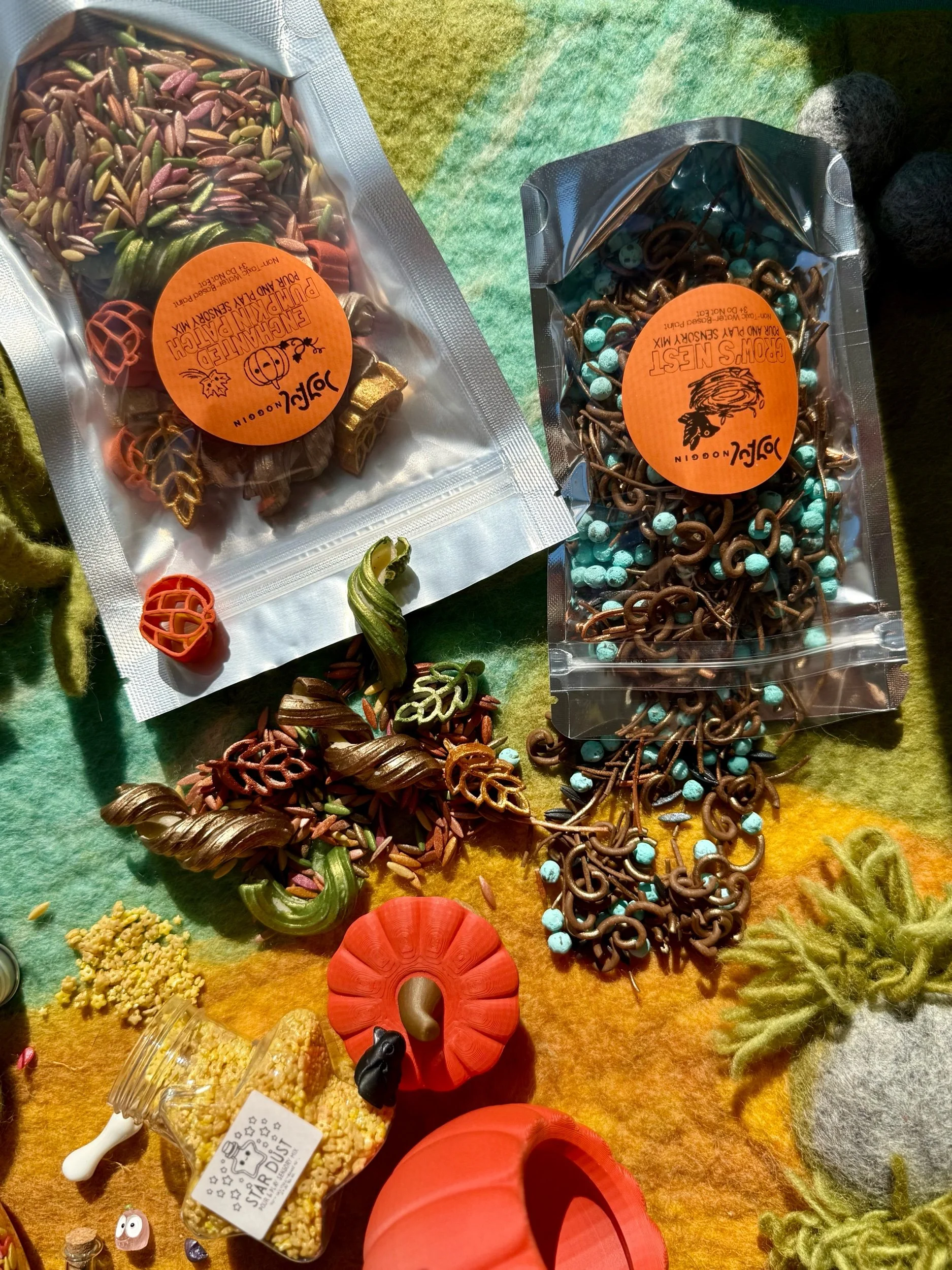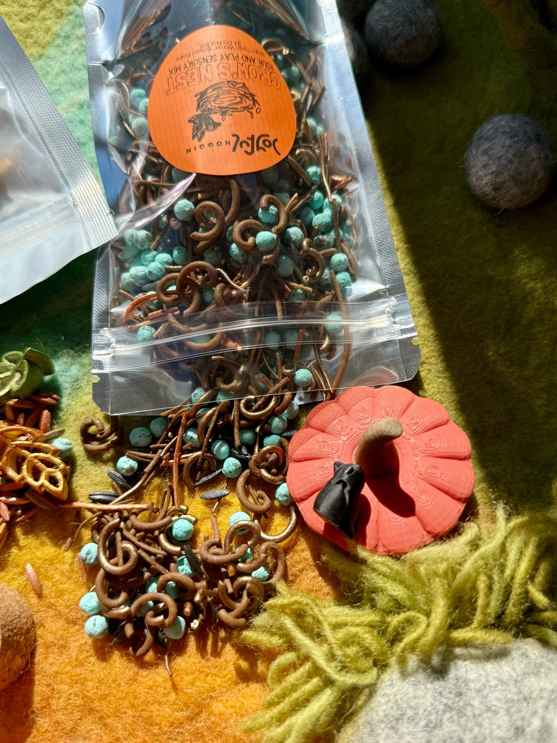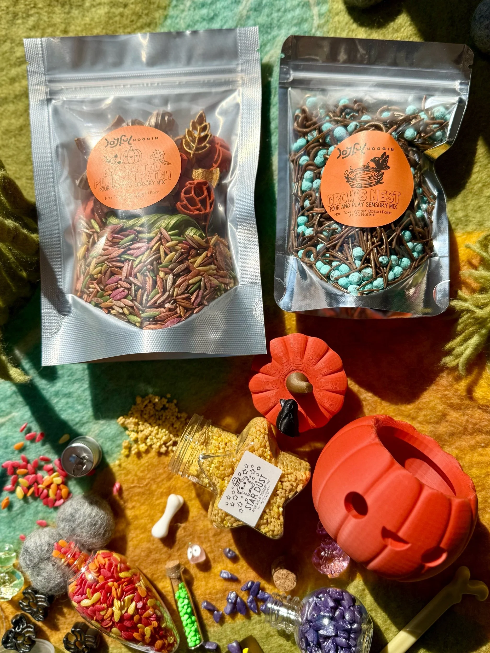 A warm, golden blend of autumn colors and textures. This mix features swirling vines, pumpkins, and a metallic glow that mimics fallen leaves and late-October sunlight—perfect for scooping, pouring, and creating a cozy forest floor for potion play.A Mini Bag of Crow’s Nest Sensory Mix