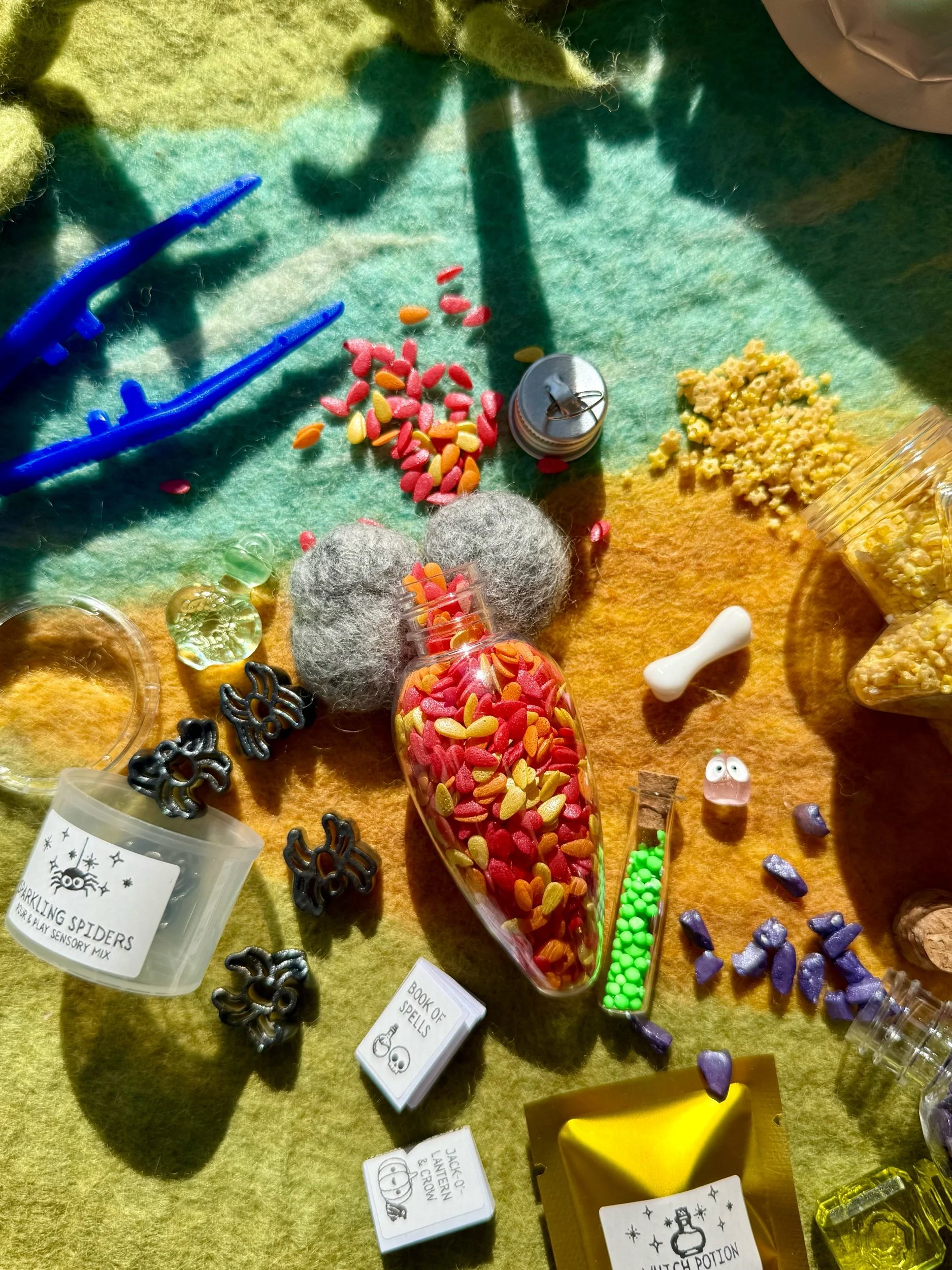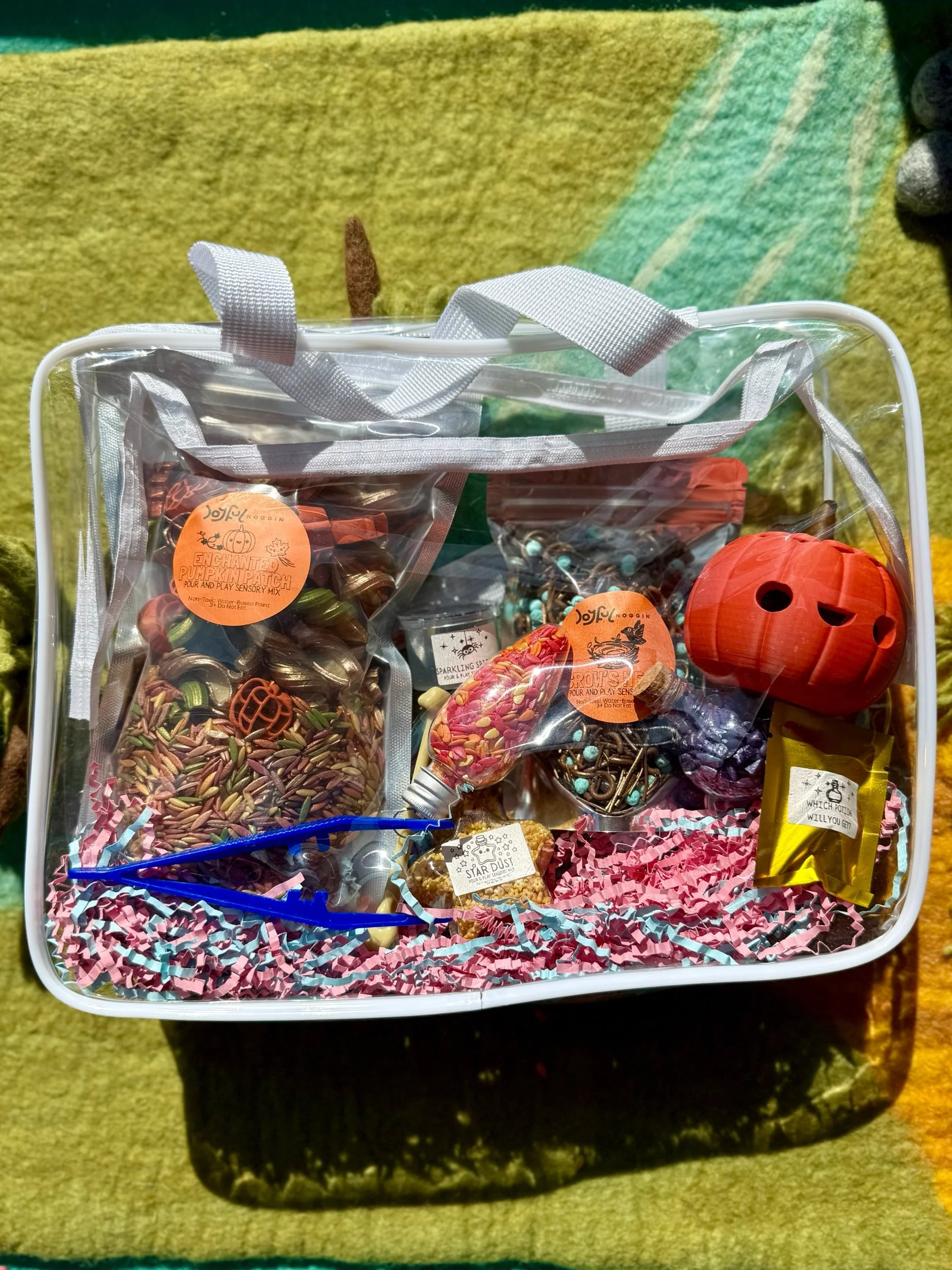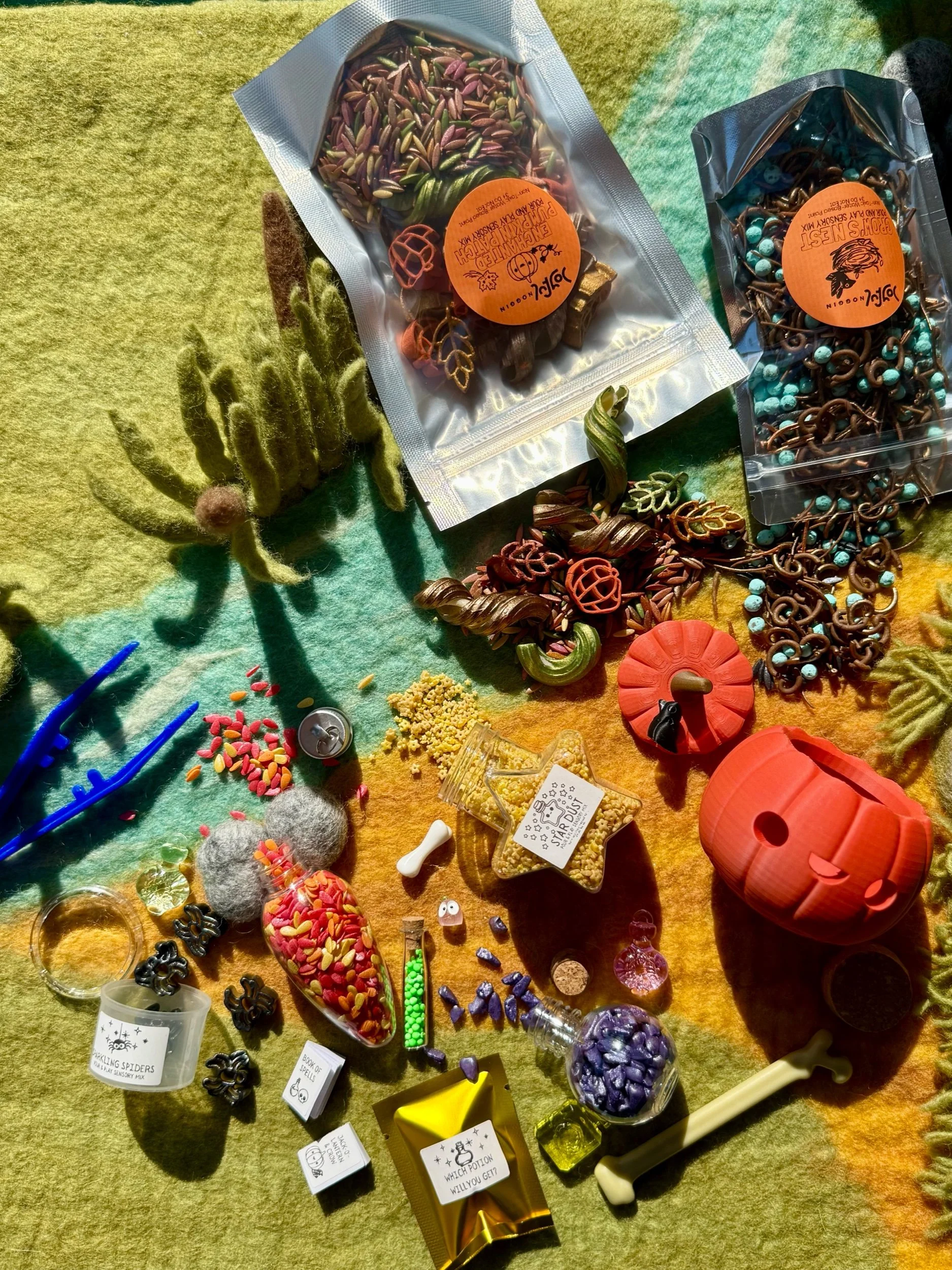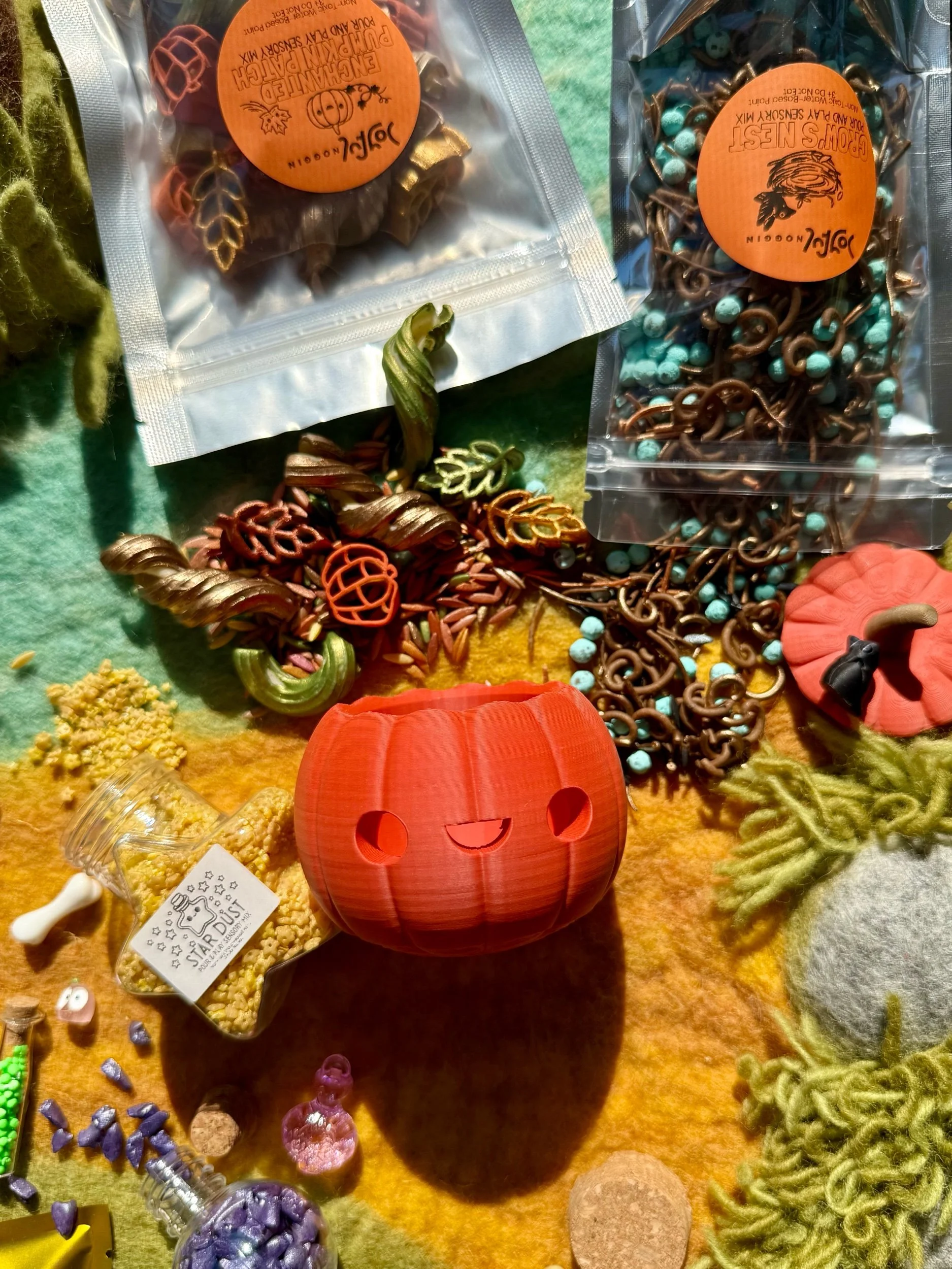 A warm, golden blend of autumn colors and textures. This mix features swirling vines, pumpkins, and a metallic glow that mimics fallen leaves and late-October sunlight—perfect for scooping, pouring, and creating a cozy forest floor for potion play.A Mini Bag of Crow’s Nest Sensory Mix