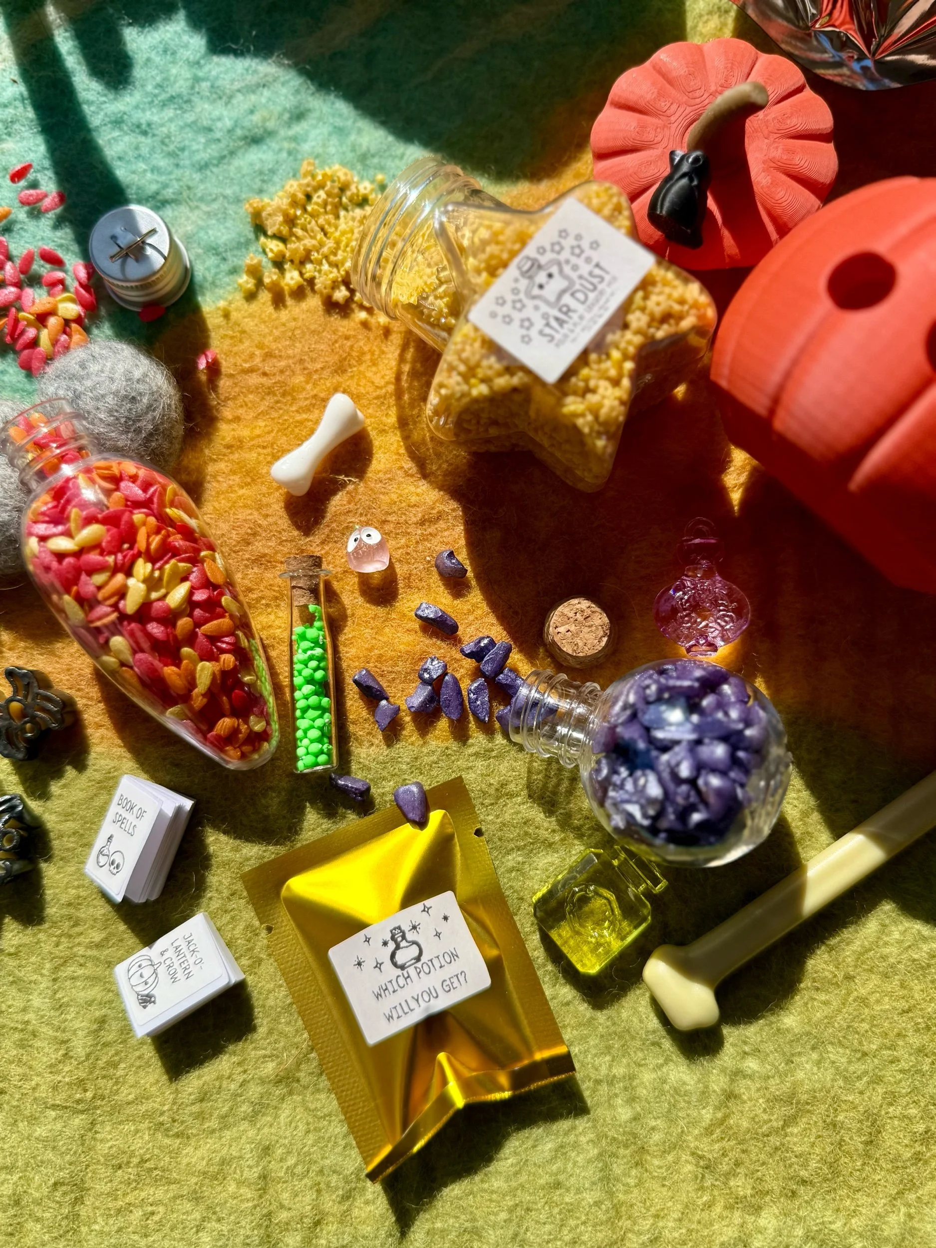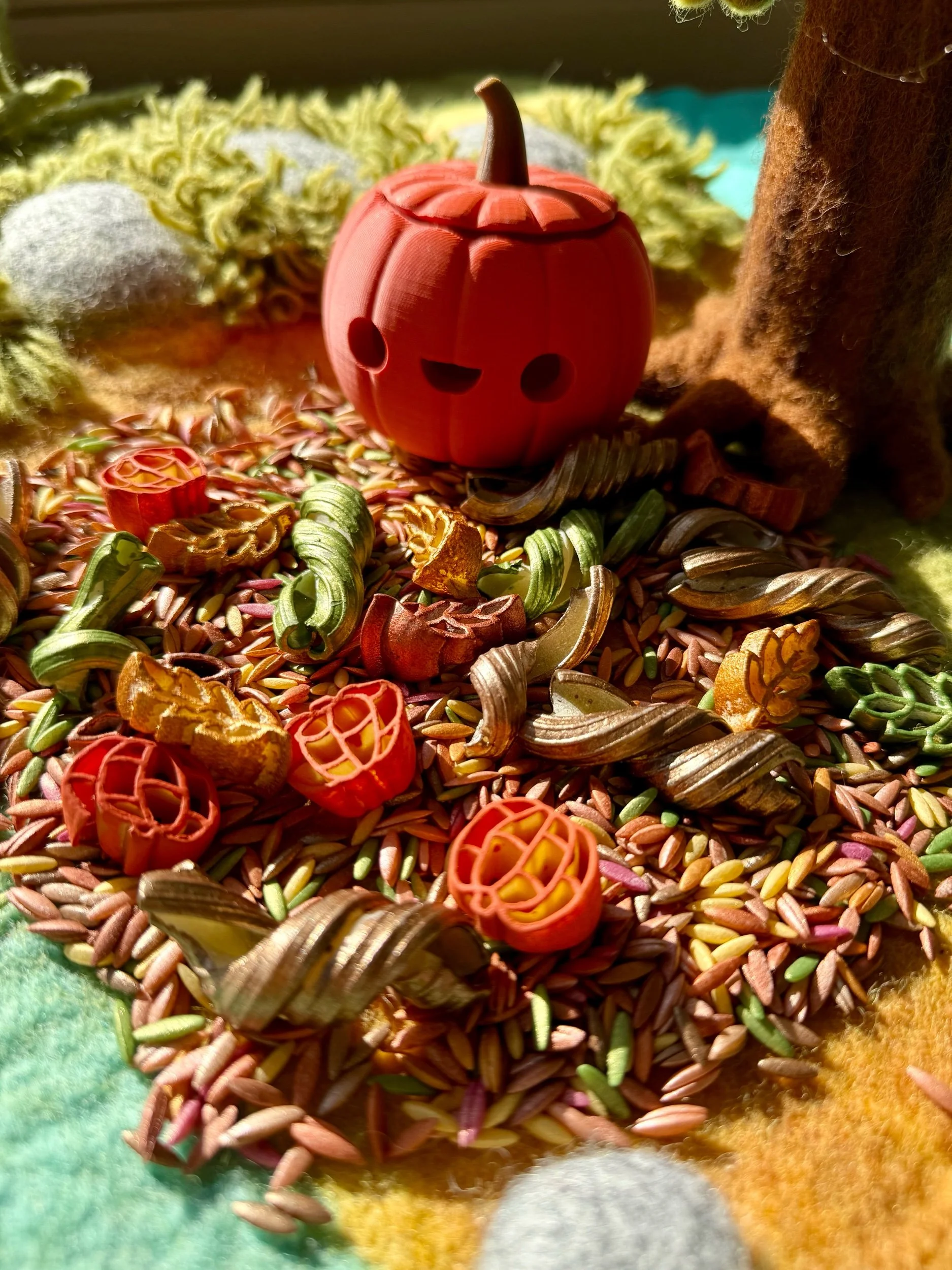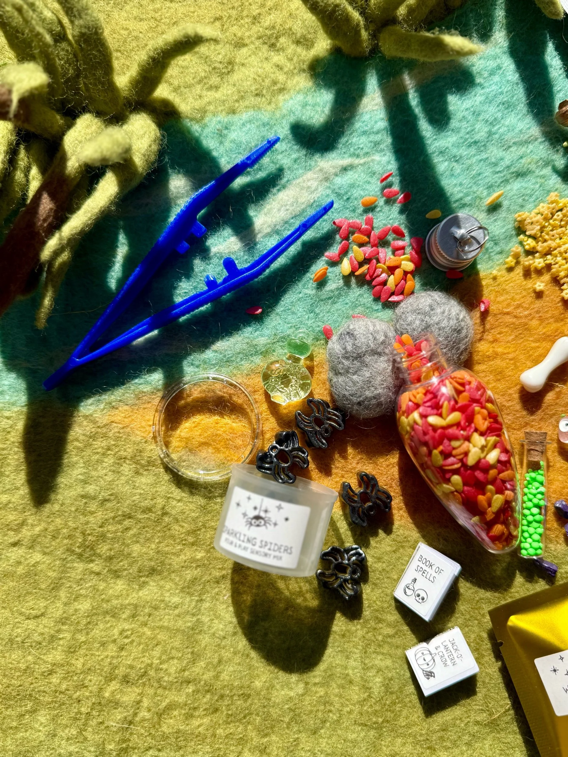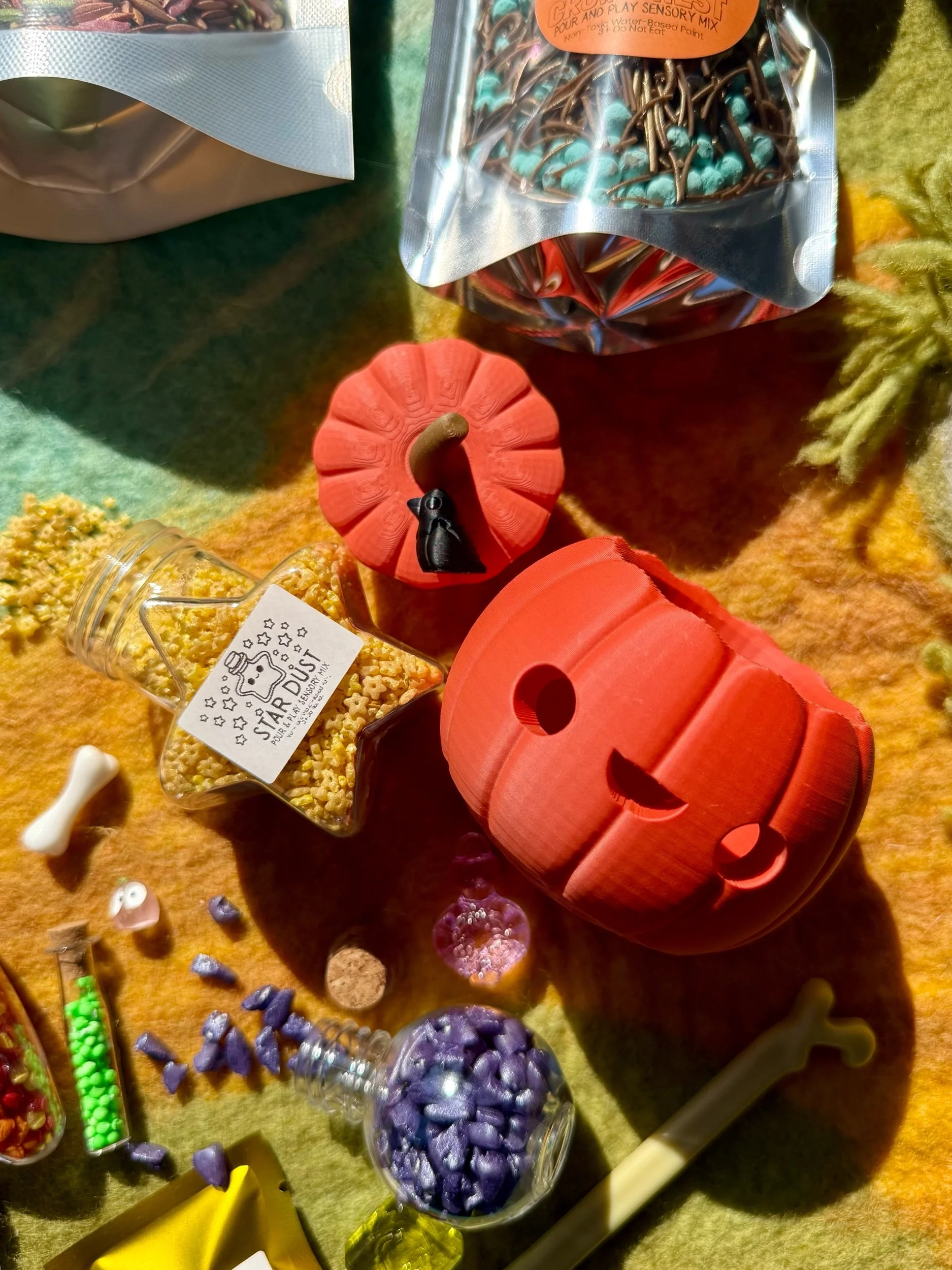 A warm, golden blend of autumn colors and textures. This mix features swirling vines, pumpkins, and a metallic glow that mimics fallen leaves and late-October sunlight—perfect for scooping, pouring, and creating a cozy forest floor for potion play.A Mini Bag of Crow’s Nest Sensory Mix