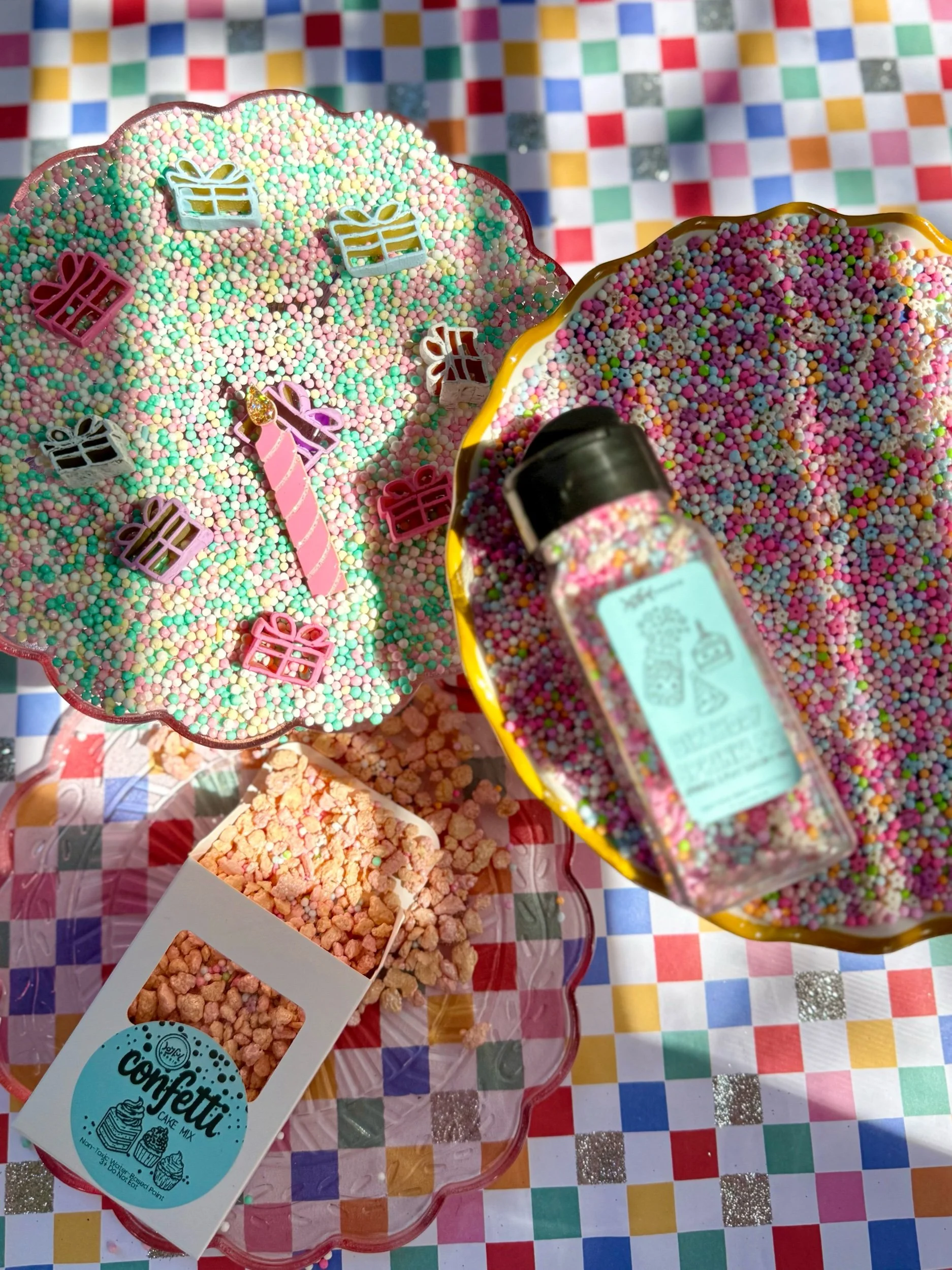 🎂 Confetti Cake Mix – A sparkly vanilla cake scented, cake themed sensory blend in an adorable Confetti Cake branded cake box. Mix comes in a bag, the box will be unfolded to protect it during shipping.