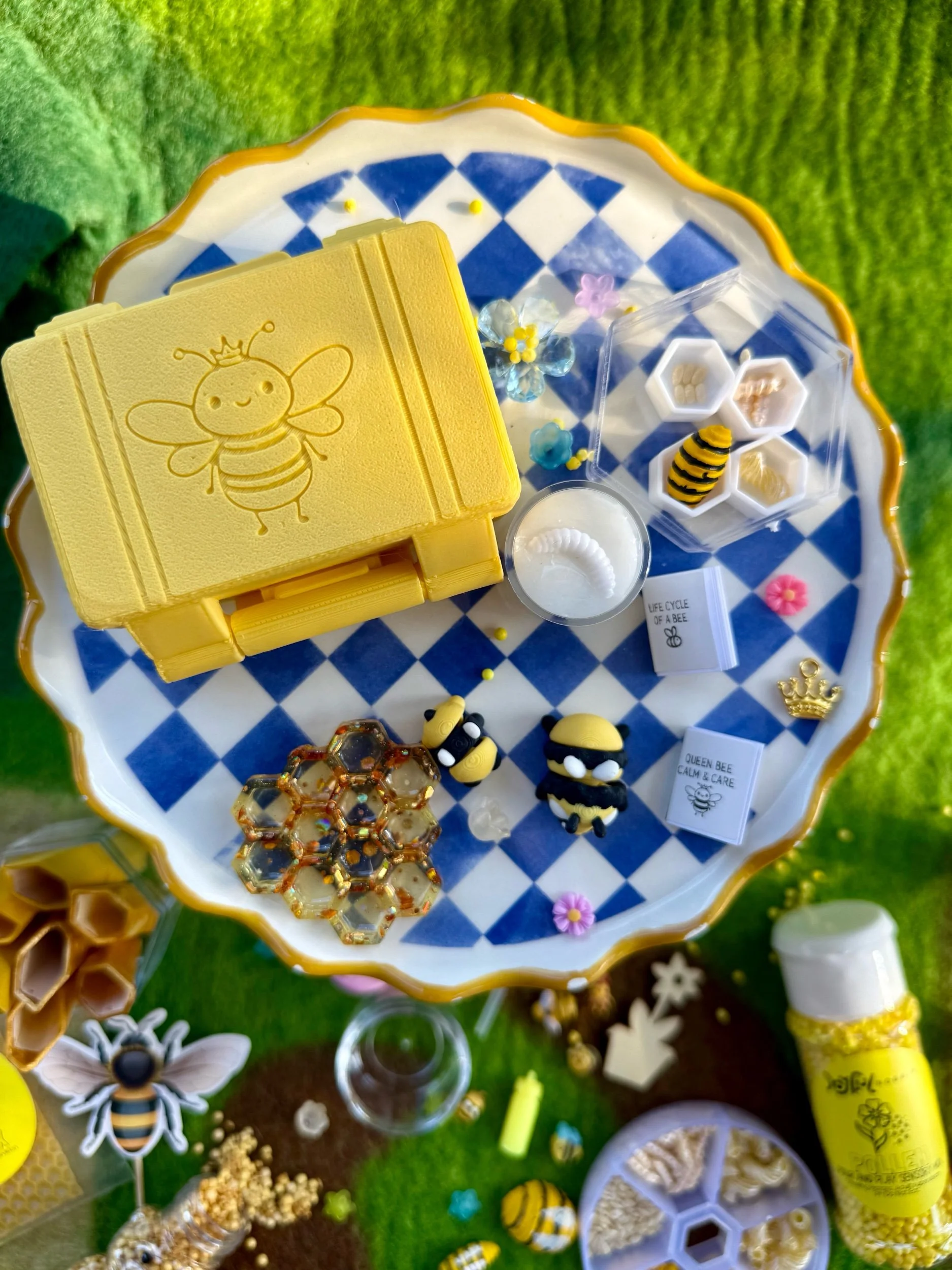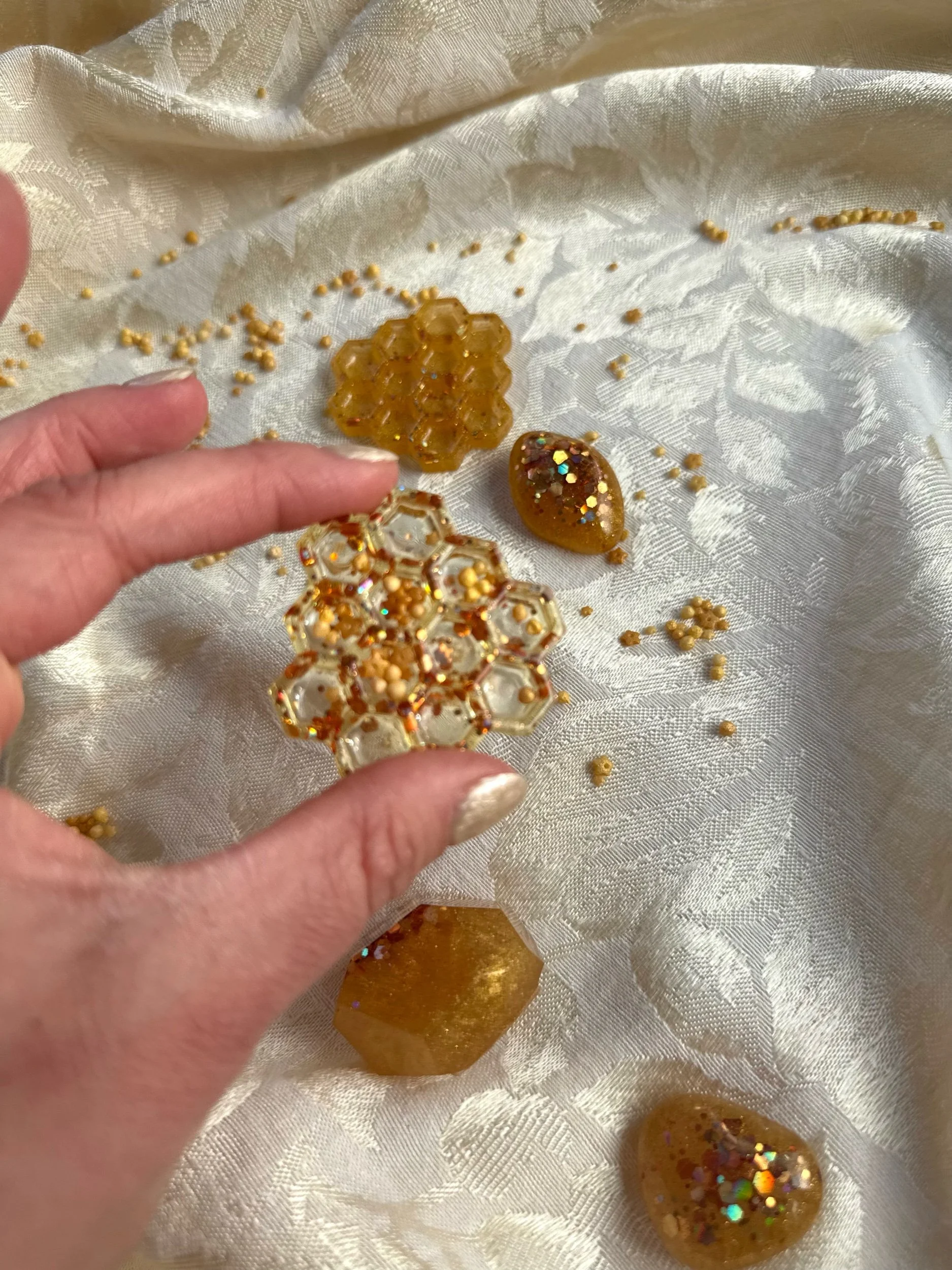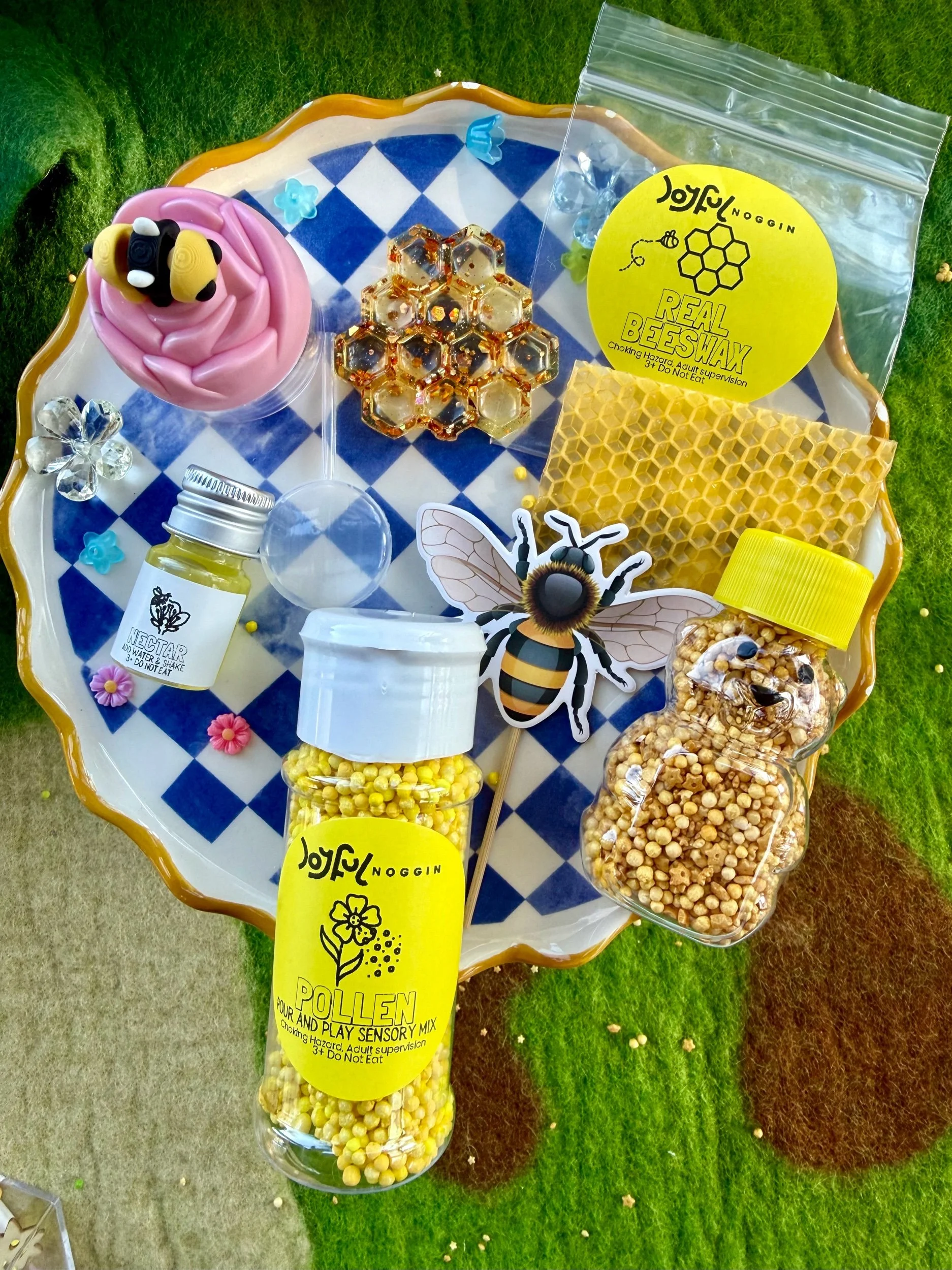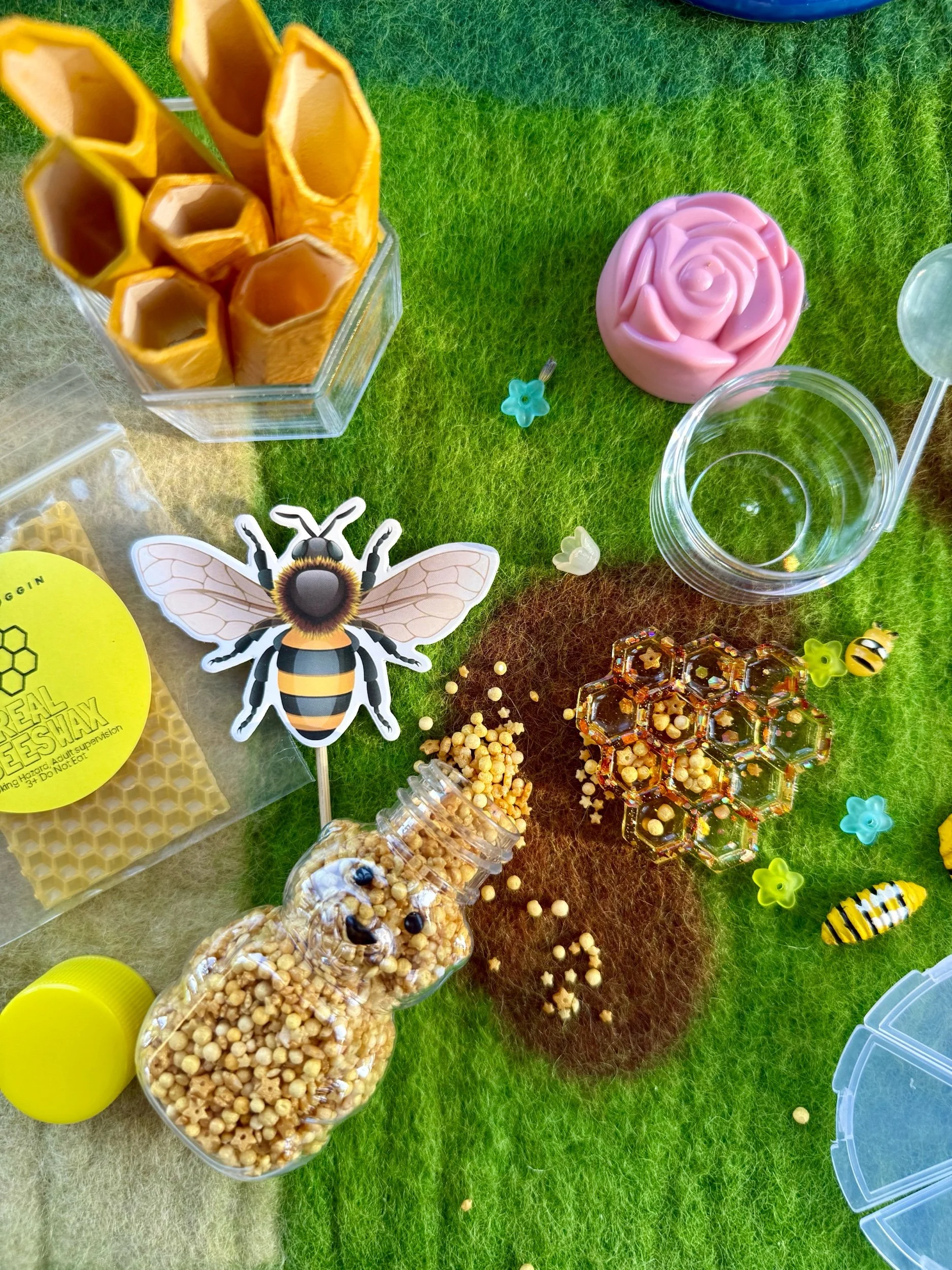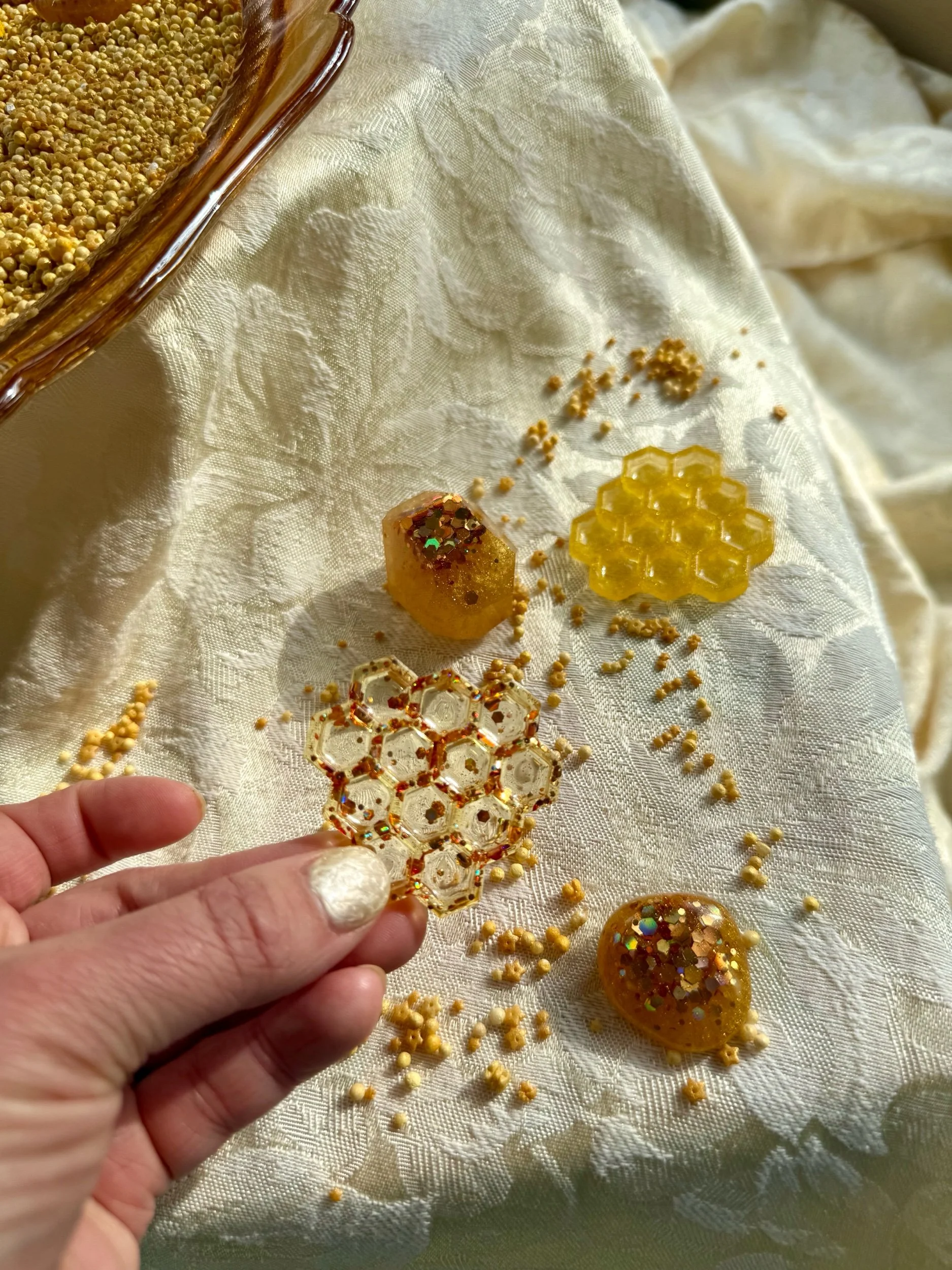 • Four beautiful, matching resin pieces by Tara – Wild Ones Resin, to pour nectar, mix, or slime onto to replicate how honey is made