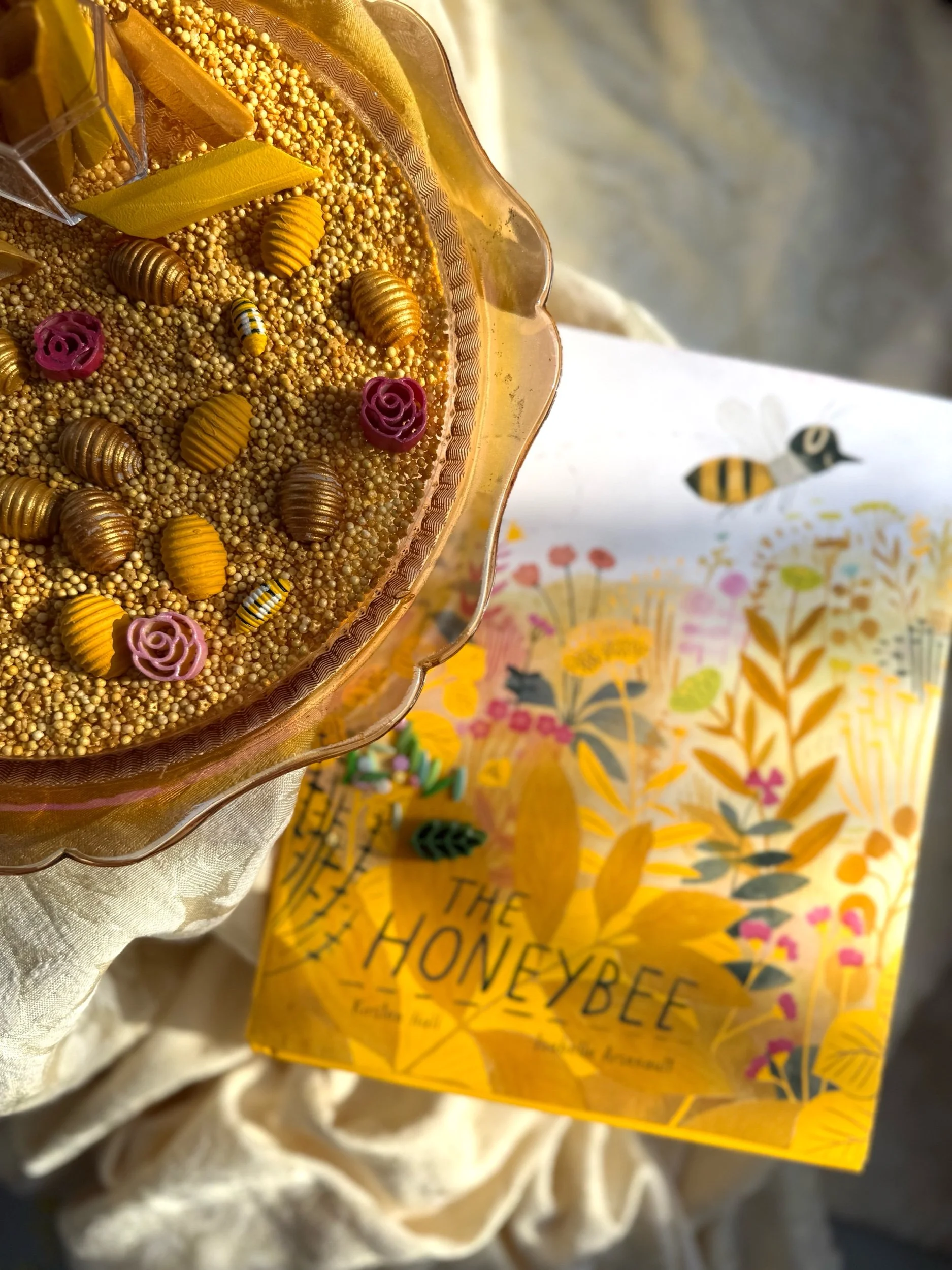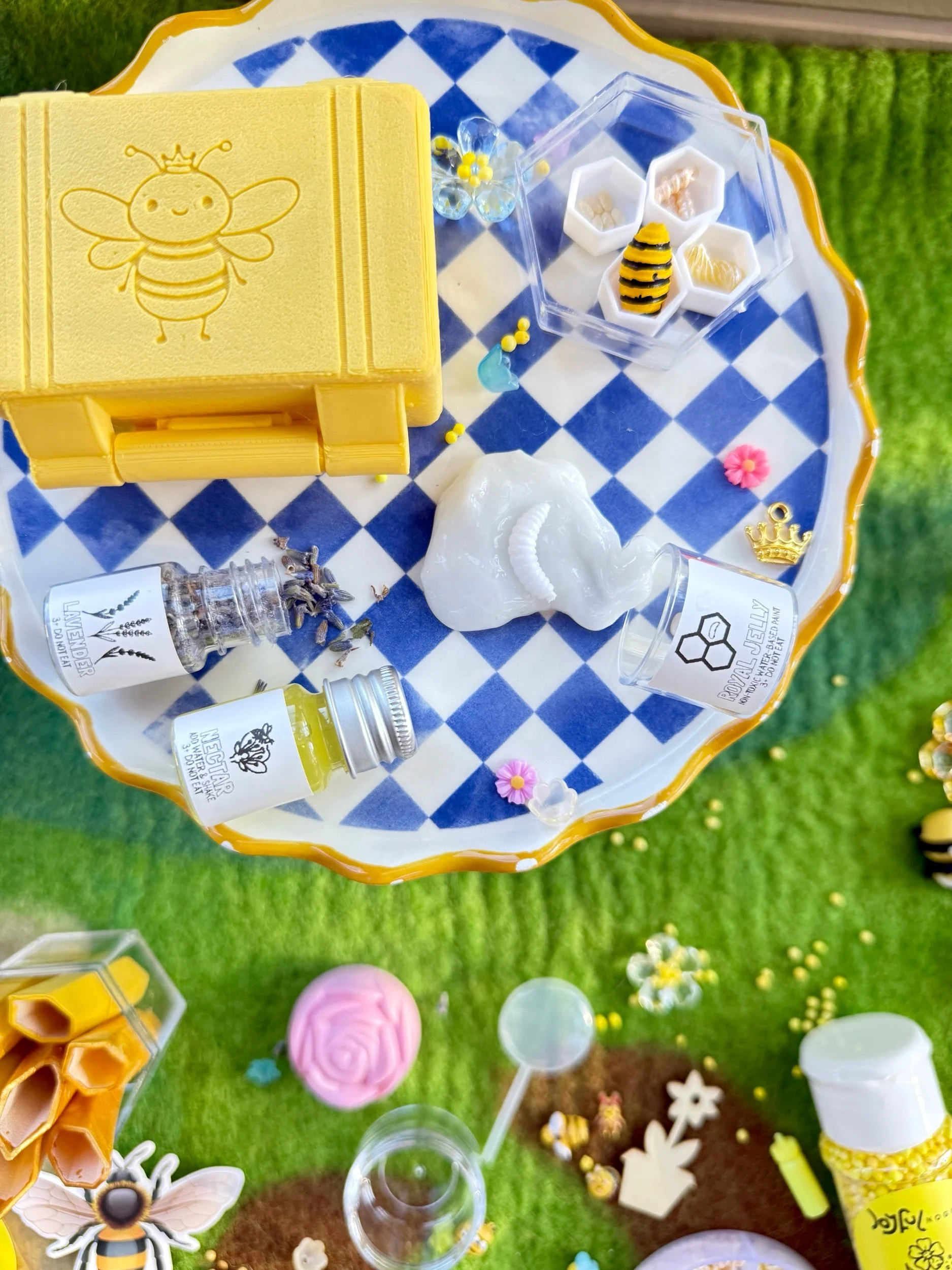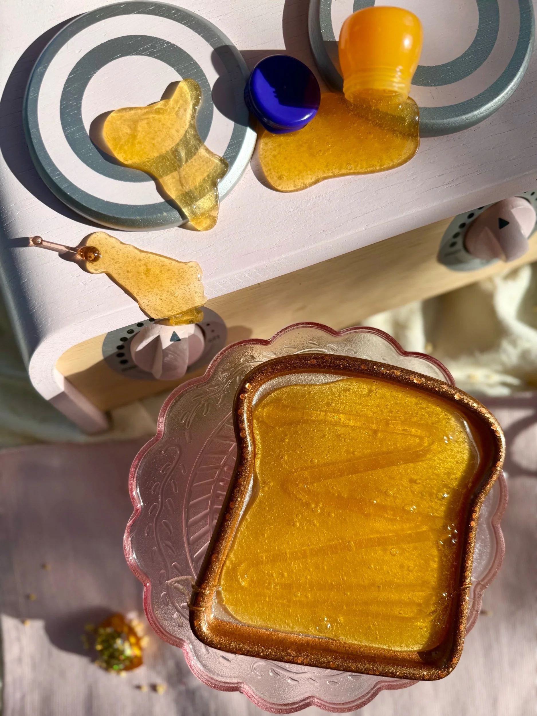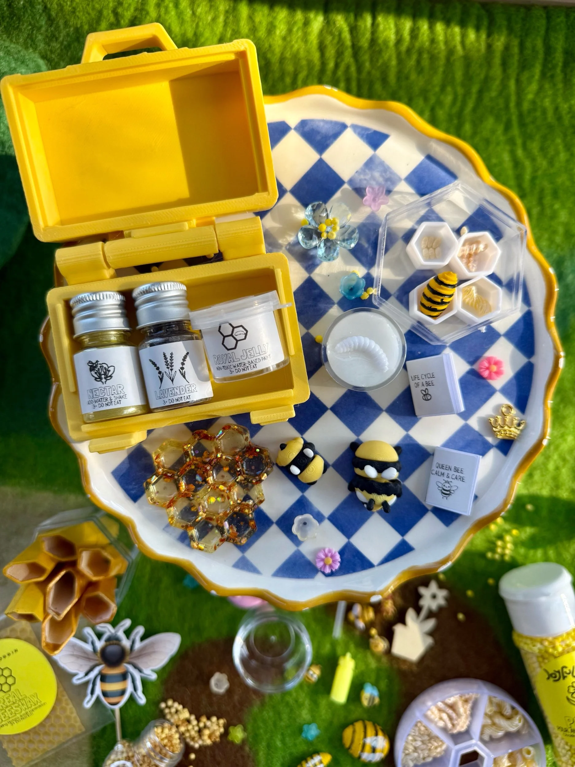 • Four beautiful, matching resin pieces by Tara – Wild Ones Resin, to pour nectar, mix, or slime onto to replicate how honey is made