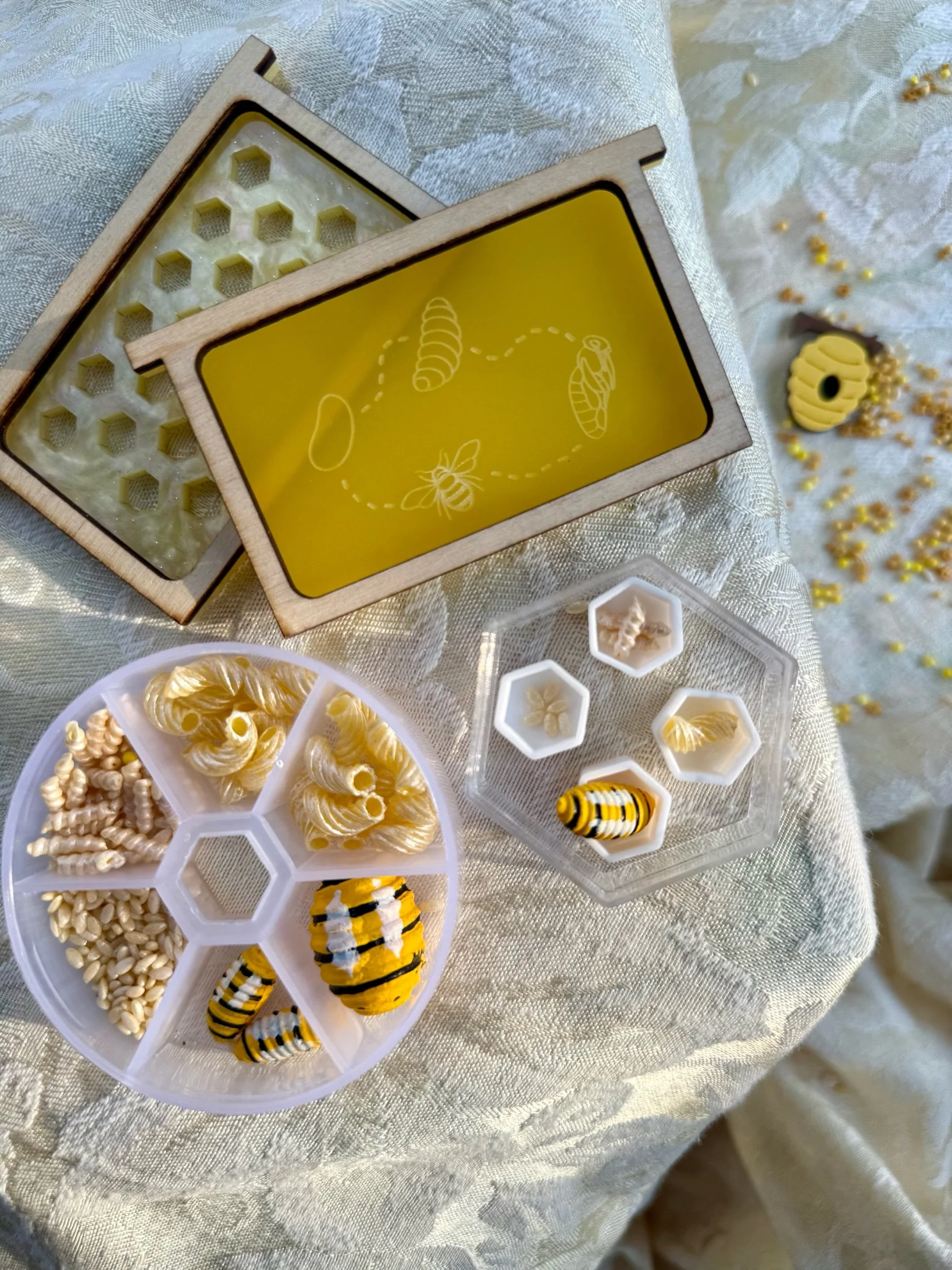 These items invite children to practice nurturing play while learning how bees care for the Queen in a real hive.