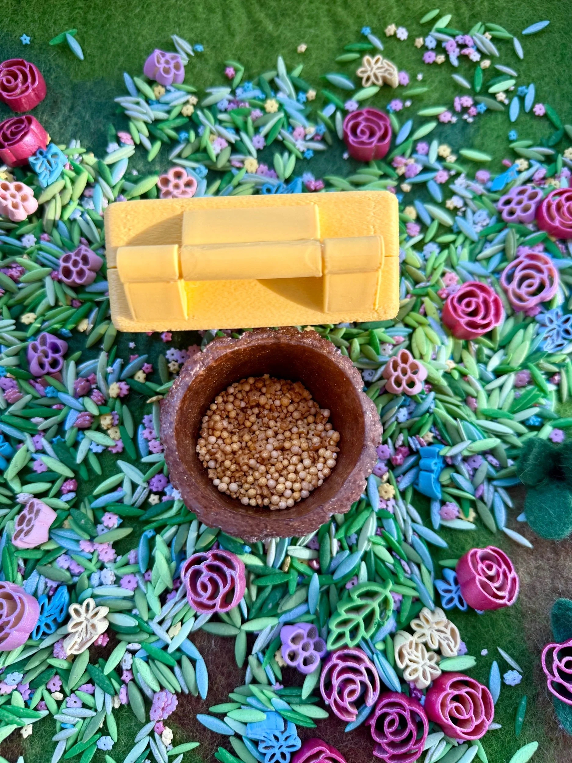 • Handcrafted Sensory Materials – MAY INCLUDE: pasta, chickpeas, corn products, and tapioca (not intended for consumption).