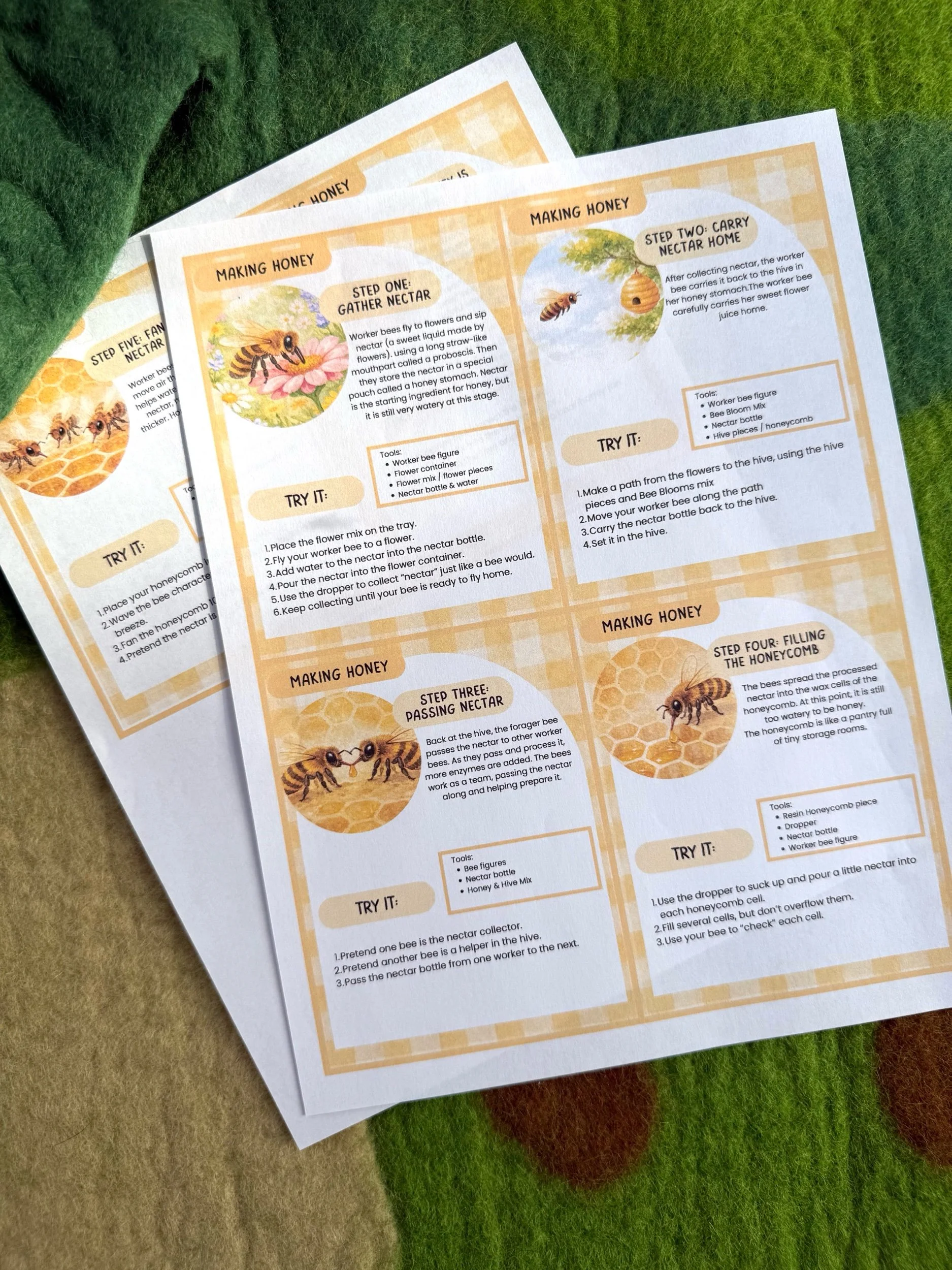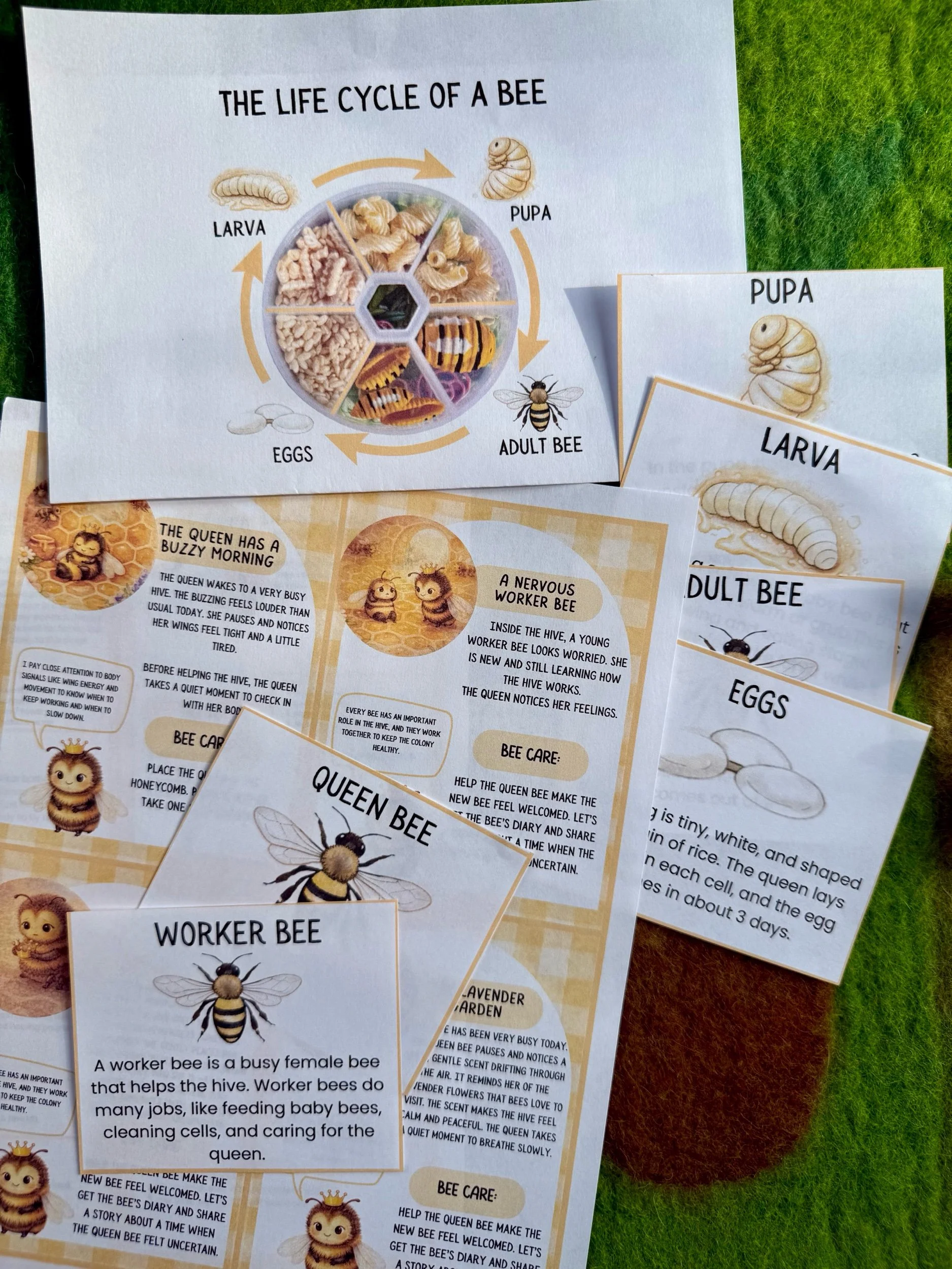 Cards that match the sensory pieces in the kit, encouraging storytelling, sorting, and imaginative hive adventures.