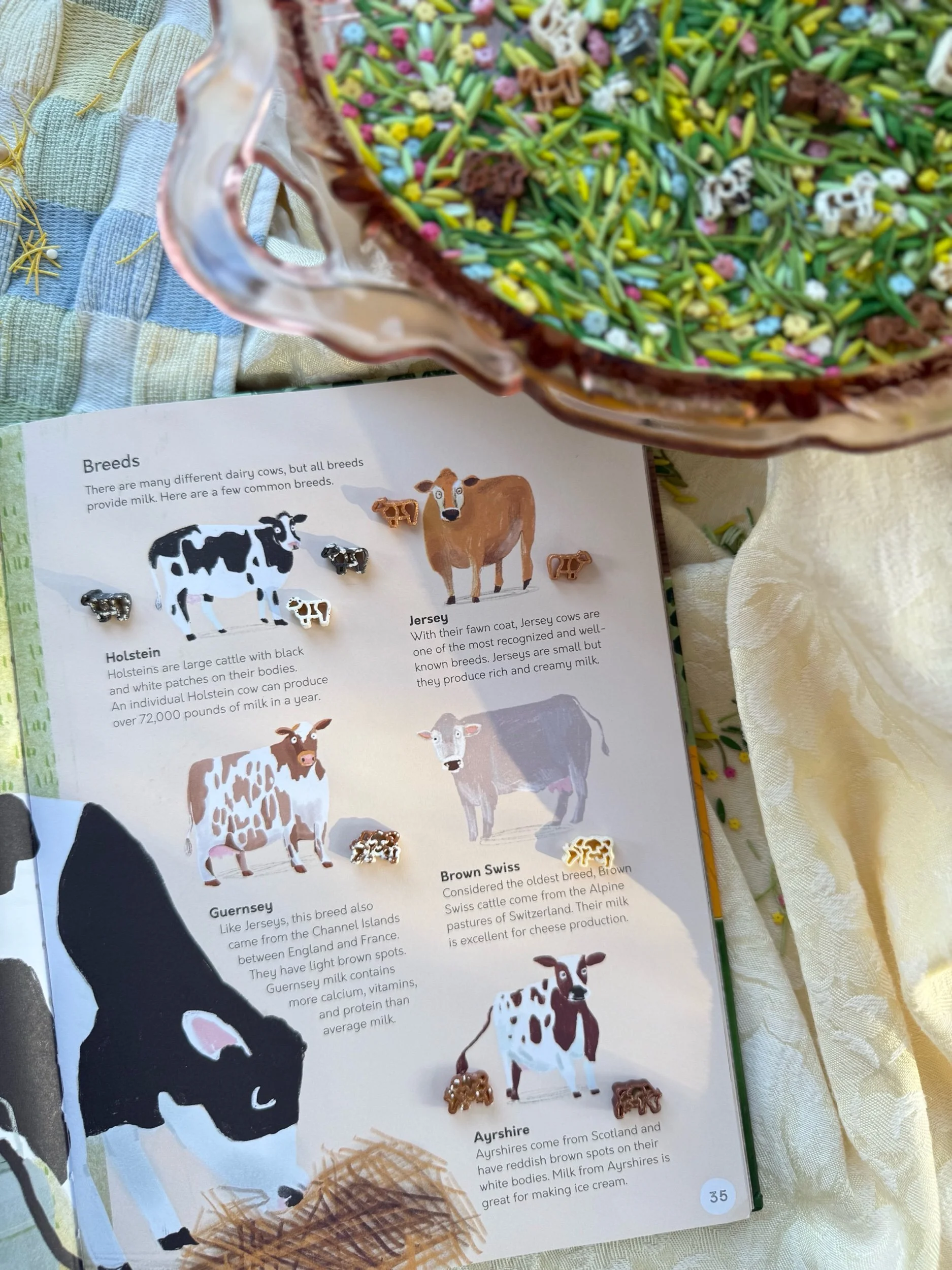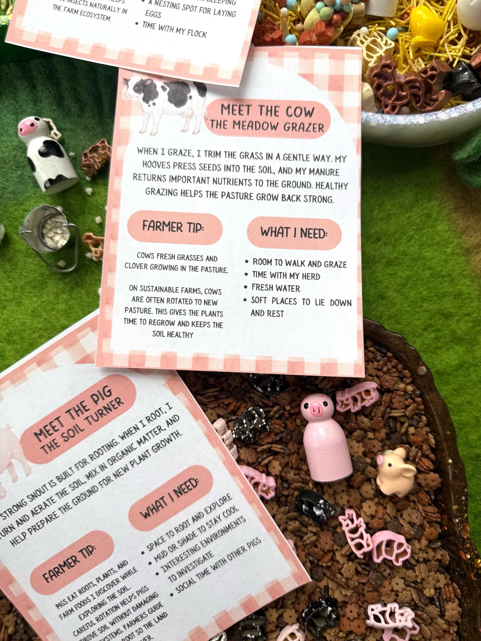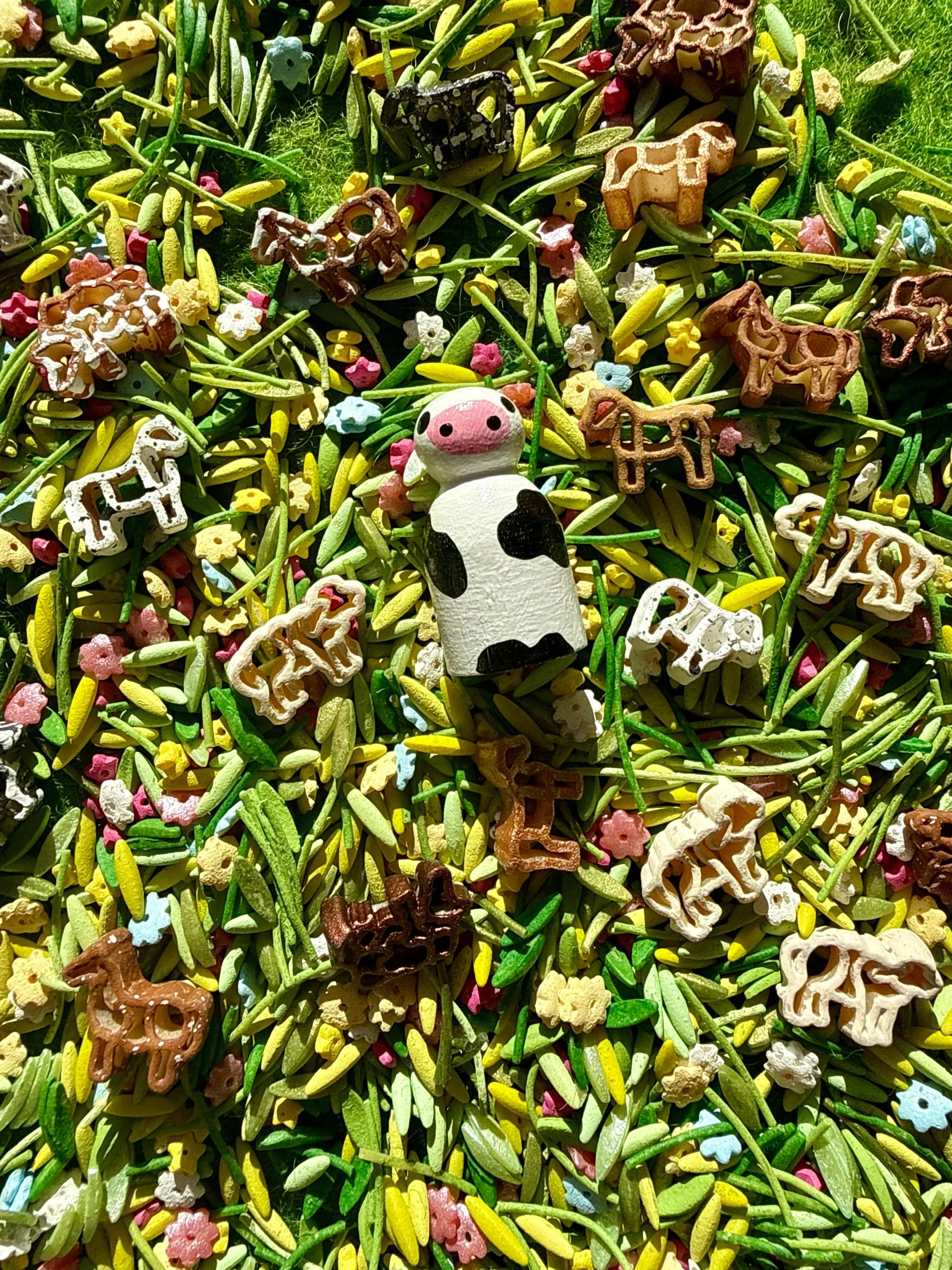 A vibrant meadow-inspired sensory mix filled with grazing cows, pigs, and sheep graze and colorful pasture plants, inspired by the biodiversity of real grazing fields.