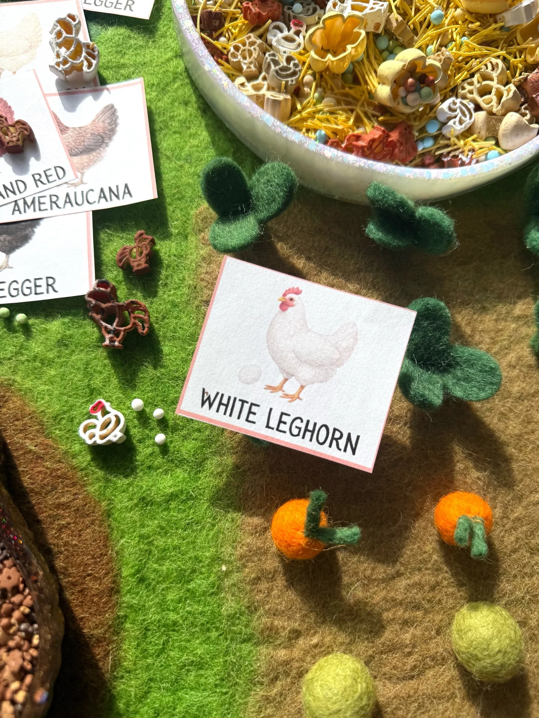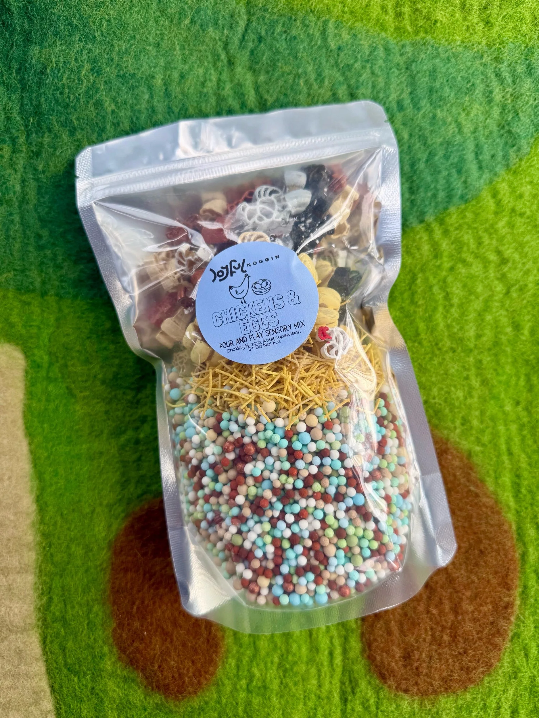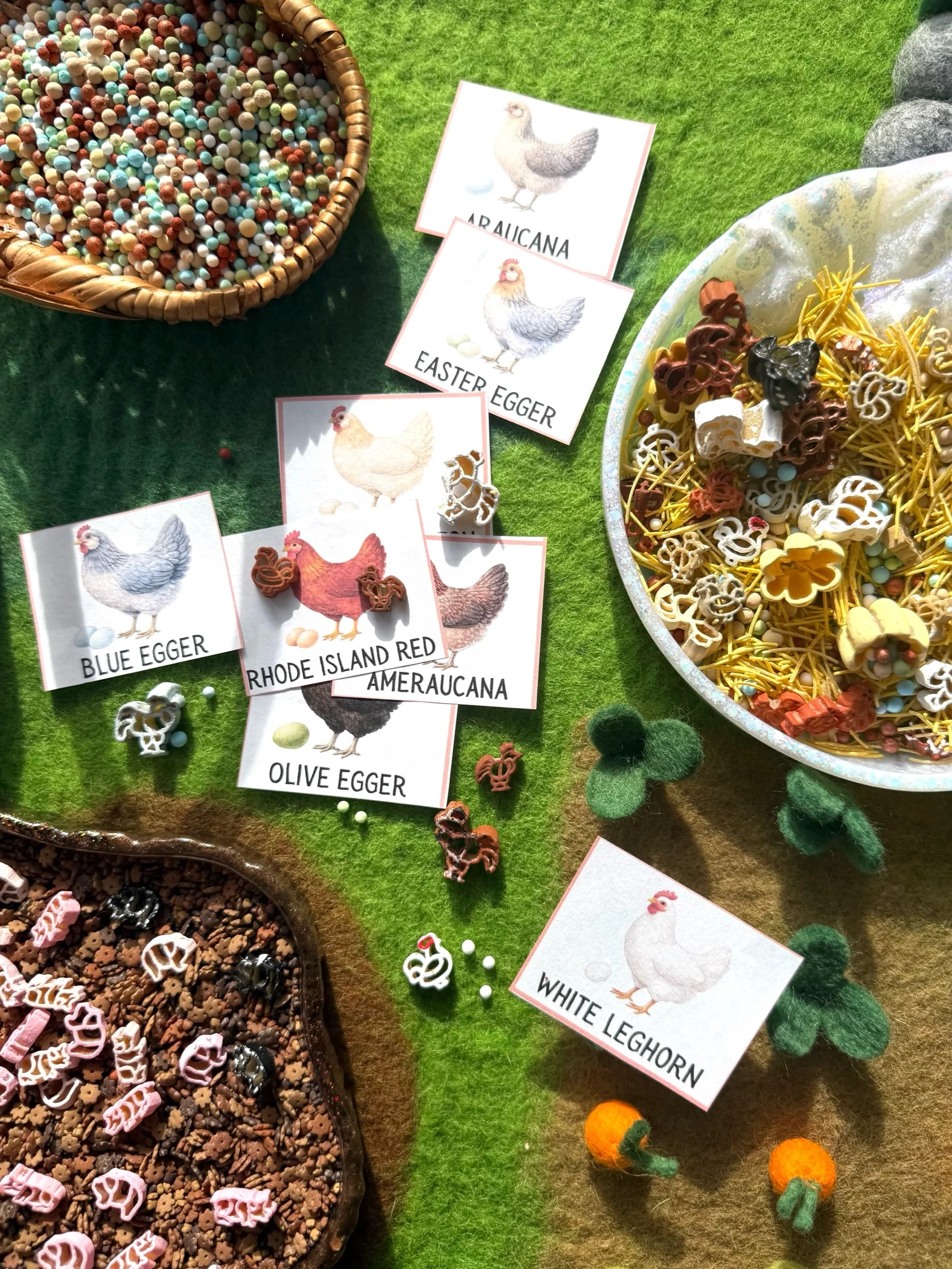The Chickens & Eggs Sensory Mix celebrates the incredible diversity found in real farm flocks. A colorful farmyard mix filled with tiny nests, diverse eggs, and chickens of many colors—just like you might find in a real backyard flock.