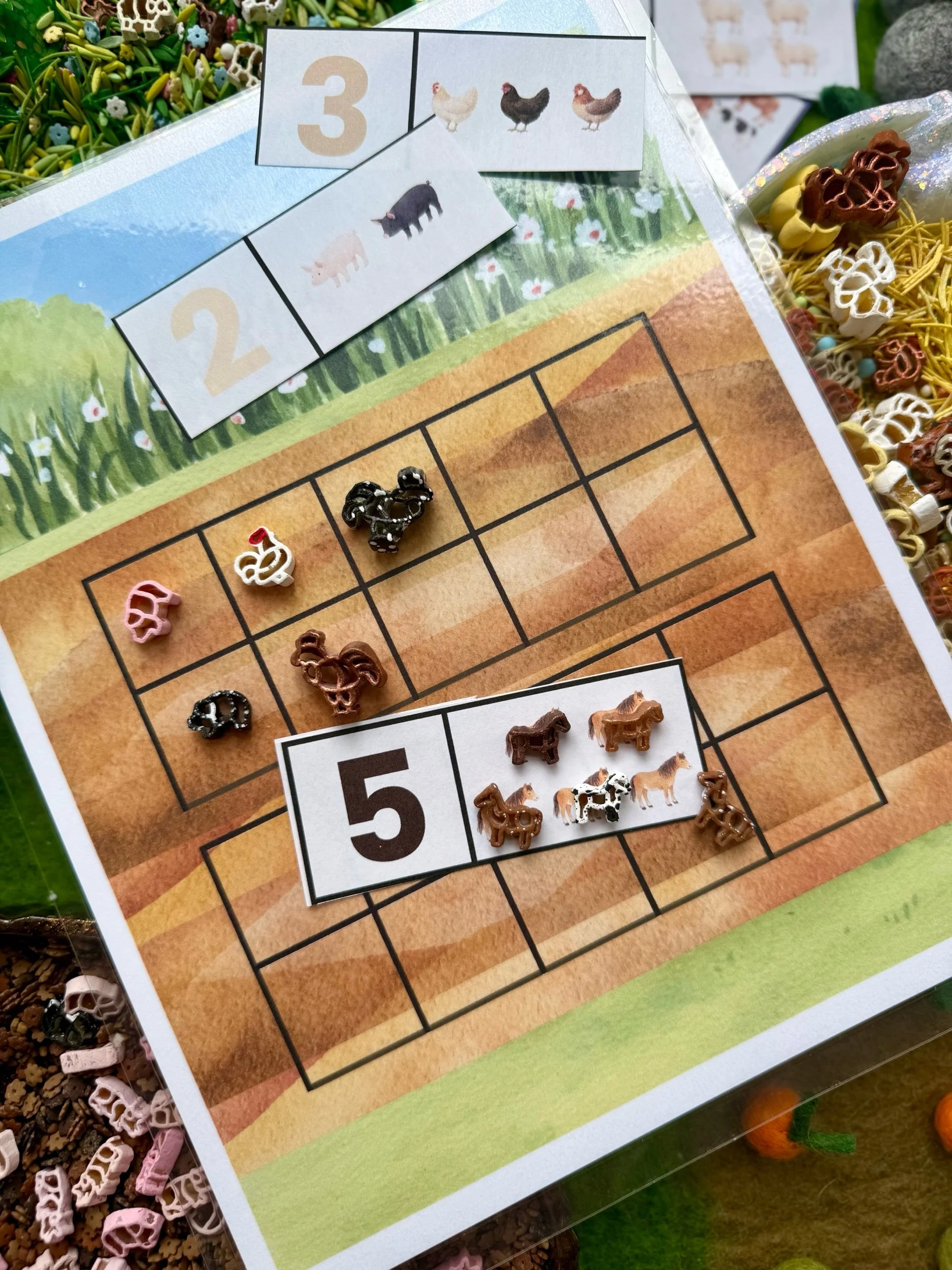 Practice counting and early math skills using the animals and farm pieces.