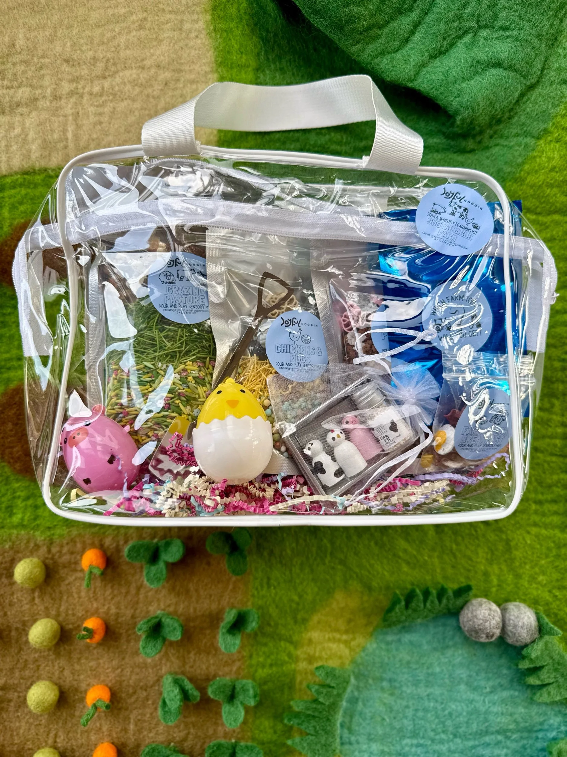 Large kits arrive in a sturdy zipper bag filled with cheerful rainbow shredded paper. The colorful paper cushions the pieces during shipping and doubles as an extra sensory material for play. When playtime is over, the bag keeps all the tiny treasures safely stored and ready for the next adventure.