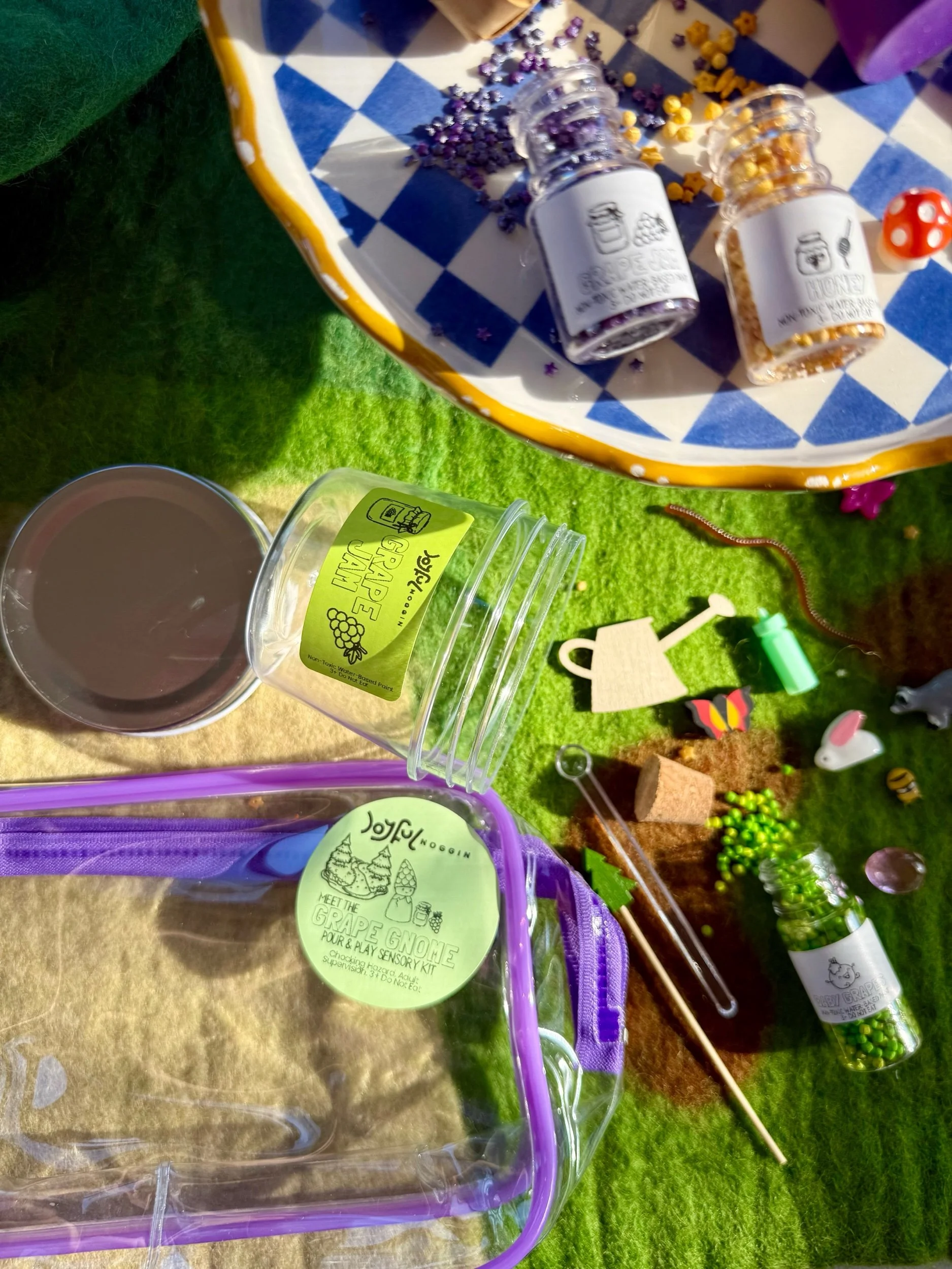All of the pieces arrive inside a miniature zippered container, creating a tiny traveling vineyard where the grape gnome keeps their garden treasures.