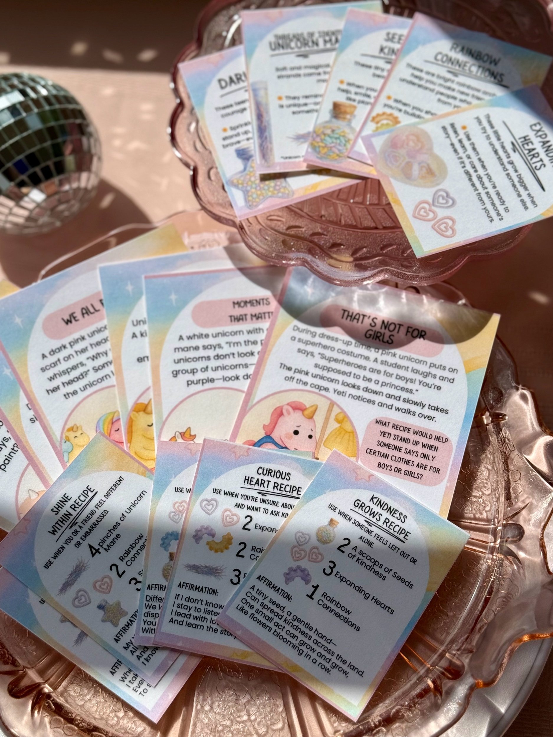 The scenario cards feature unicorns and yetis navigating real-world situations where allyship, compassion, and inclusion are needed (e.g., when someone feels left out, misunderstood, or teased). Children read or listen to the scenario, then choose a recipe or create their own using the ingredients to help solve the problem.
