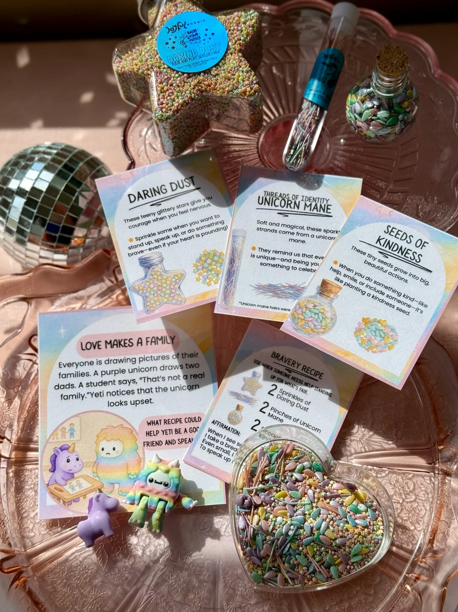 Each ingredient card matches a sensory item from your kit (like Seeds of Kindness or Expanding Hearts) and includes a short description of what that ingredient symbolizes. These cards help children build emotional vocabulary and explore core values like bravery, kindness, identity, and connection through open-ended play.